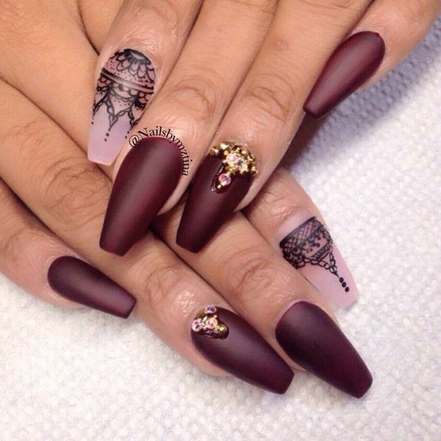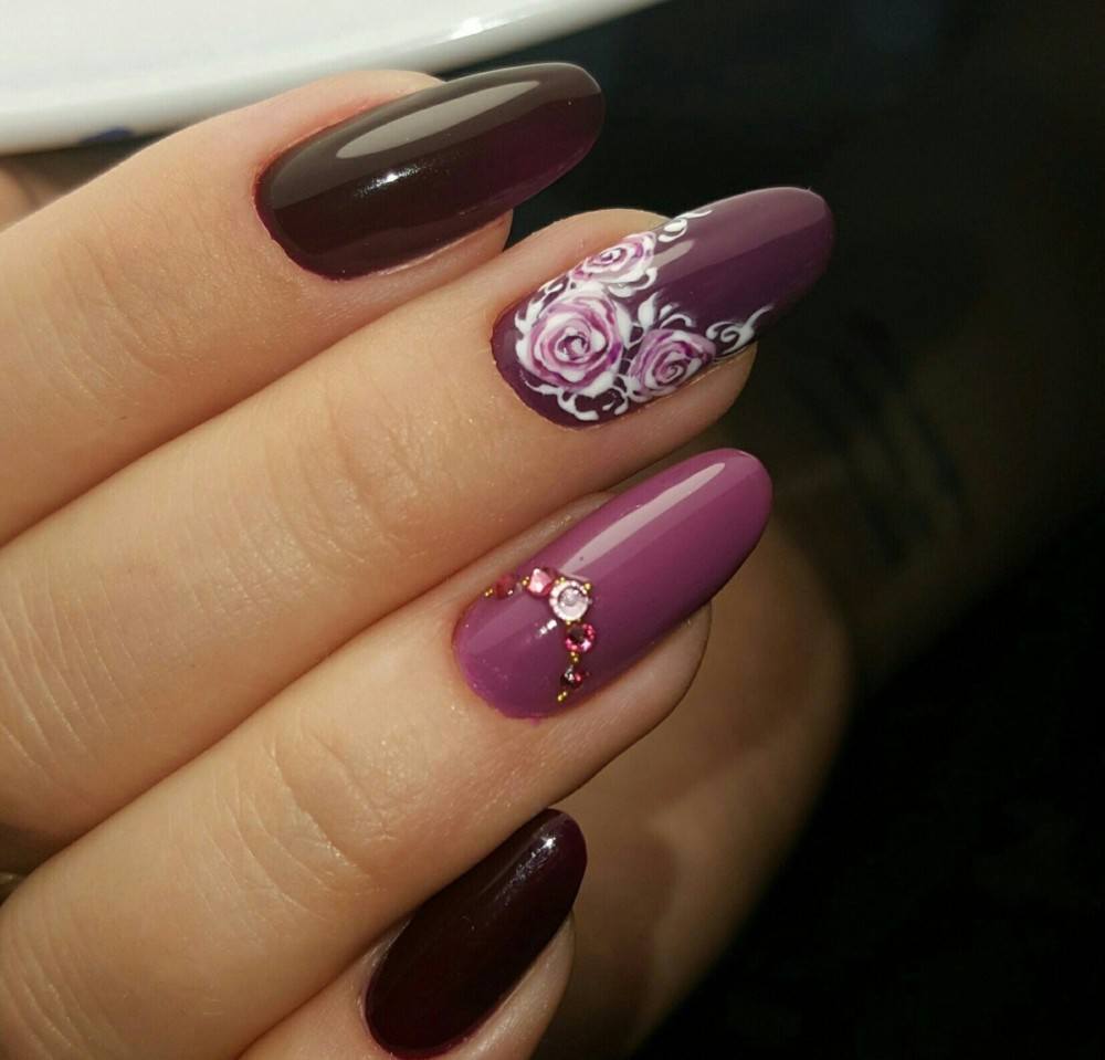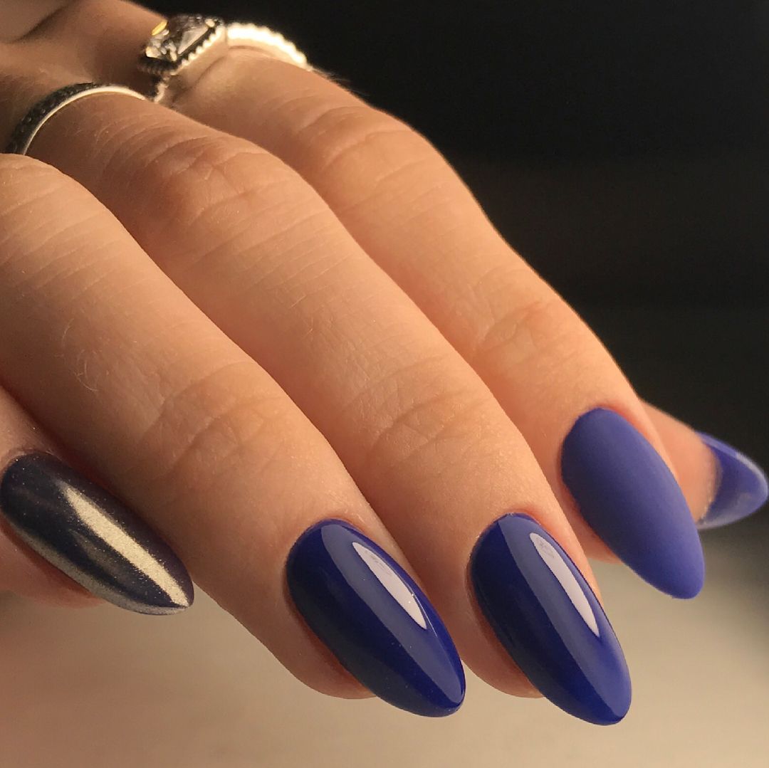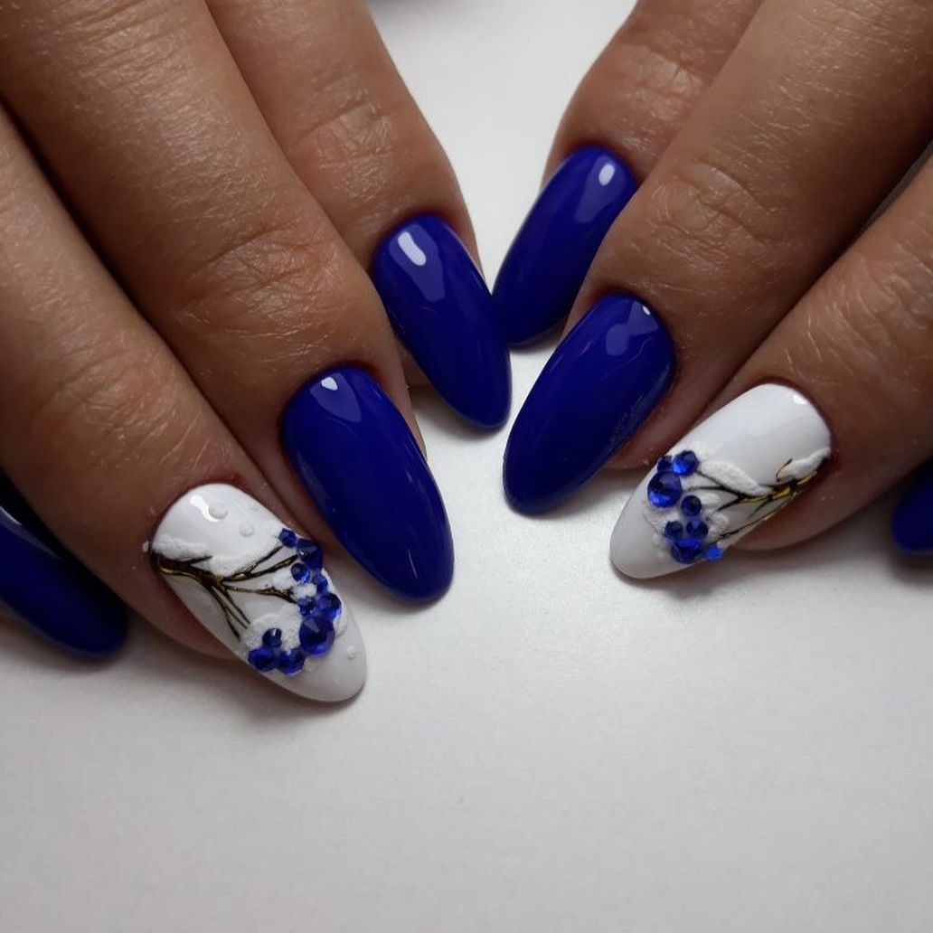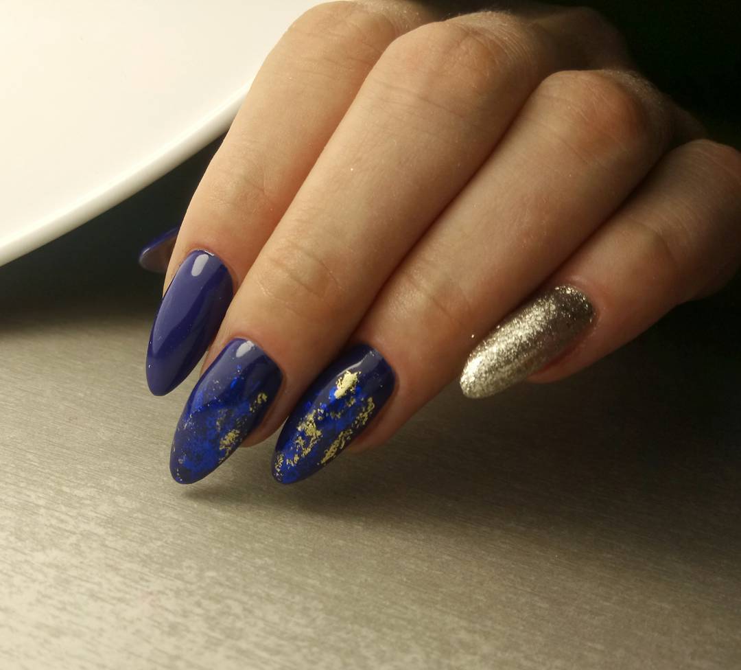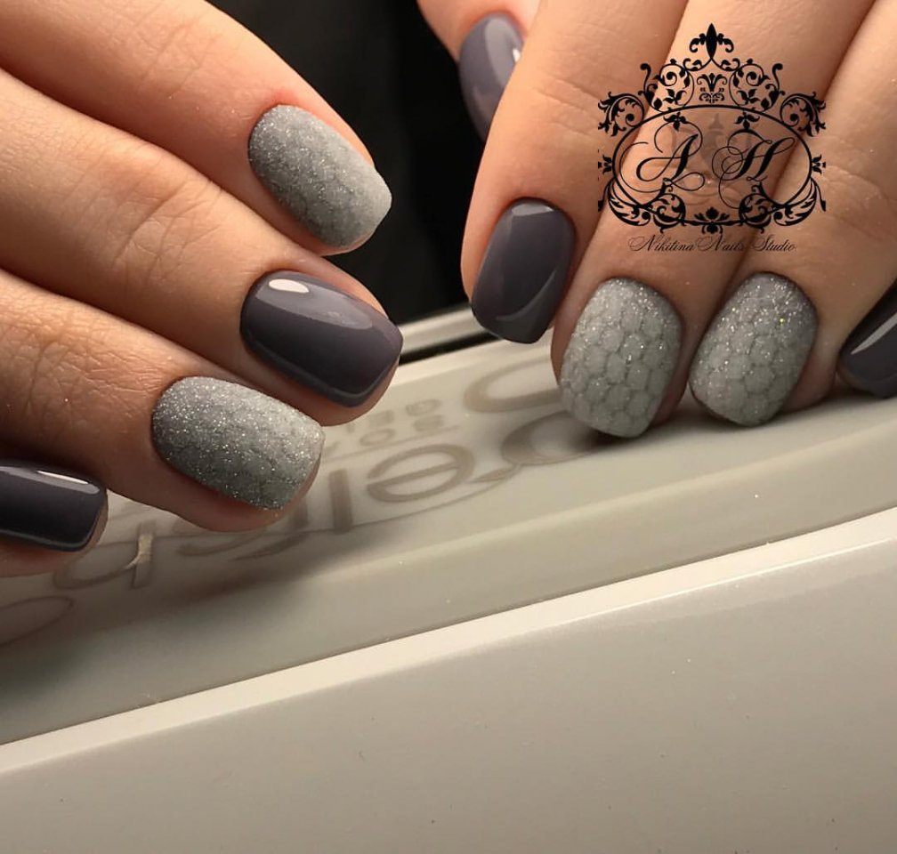Интересно сочетать матовый и блестящий маникюр: несколько матовых ногтей насыщенного баклажанного цвета, несколько – покрытых сияющим серебряным цветом. В сочетании с темно-синим матовым лаком может быть использован сине-серебряный градиент, украшенный несколькими синими камушками, расположенными вдоль основания ногтя – в центре самый крупный, по краям чуть меньше.