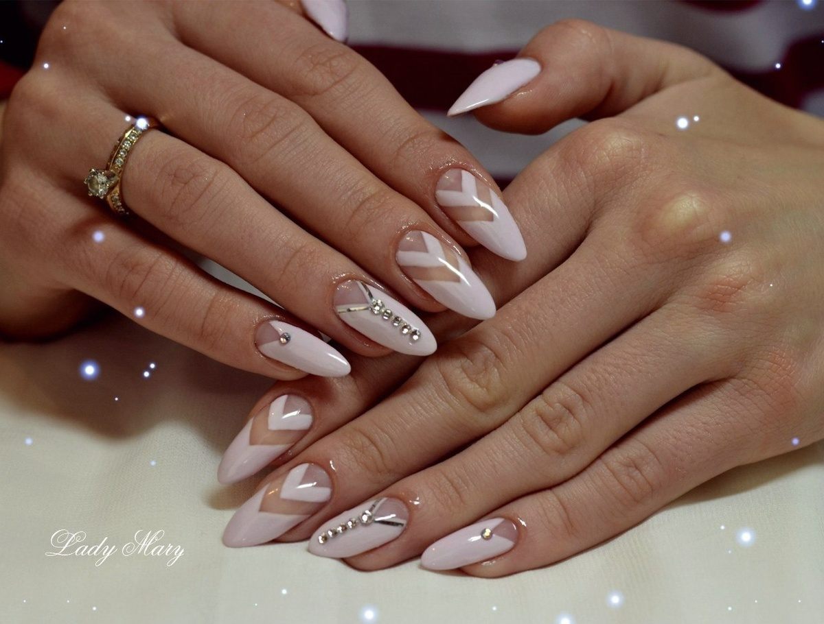 Никаких острых углов – в качестве формы для ноготков невесты лучше всего подойдёт овальный символ, поскольку именно в таком виде они будут казаться максимально естественными. Что же до выбора цветов и рисунка: главное, чтобы они гармонировали со свадебным нарядом – кислотные тона здесь явно будут лишними, зато тот же белый, салатовый либо бежевый во всём многообразии их оттенков будут смотреться чудесно.