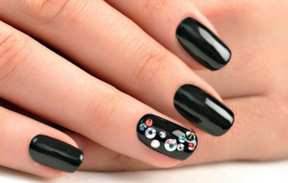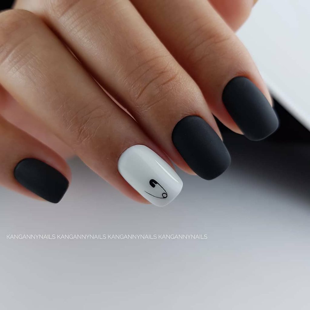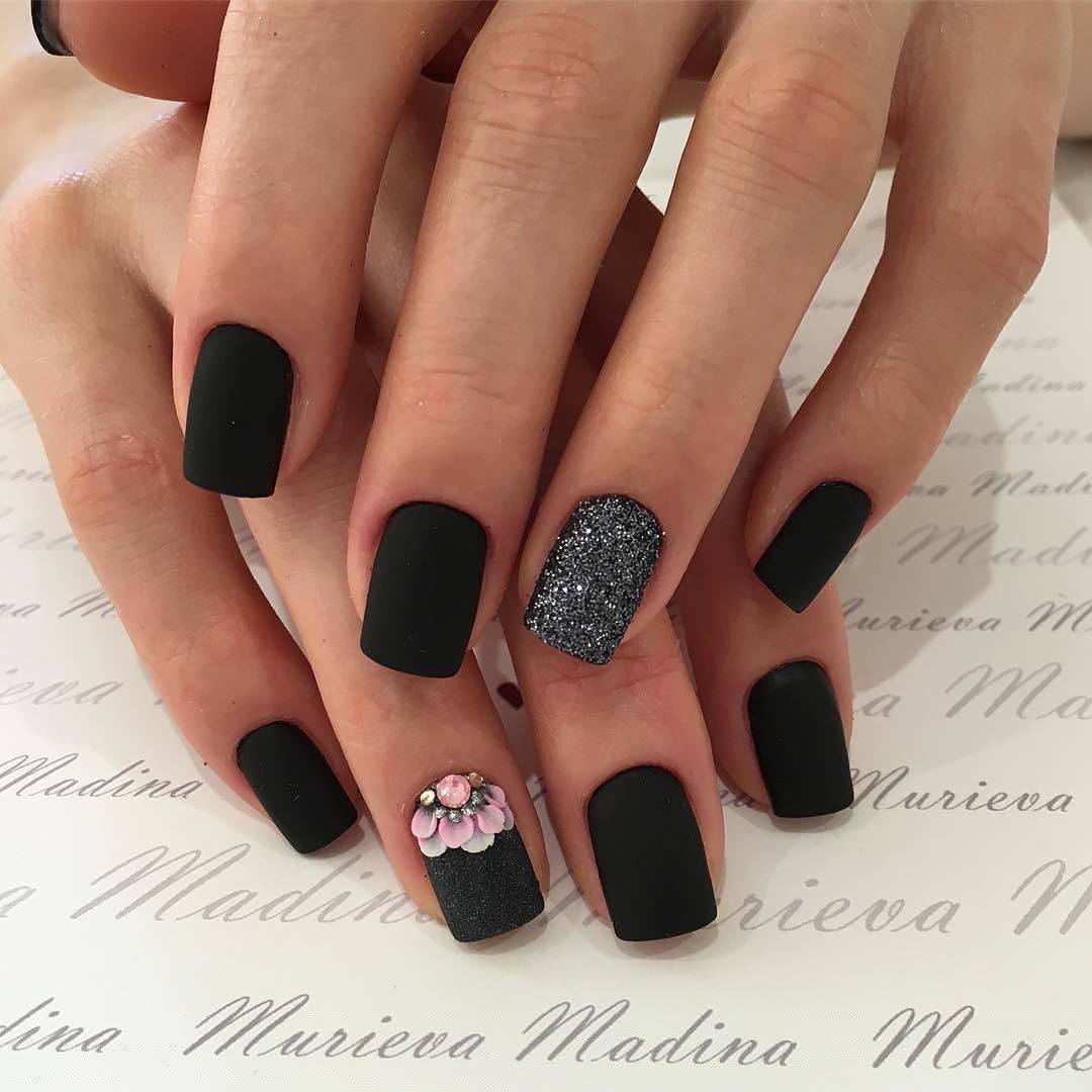 Черный цвет может быть использован и в сочетании с розовым. Лунный маникюр, выполненный этими оттенками, смотрится крайне интересно: некоторые короткие ногти окрашиваются розовым, некоторые – черным с розовой лункой, место перехода от розового к черному декорируется треугольником, выполненным блестящим лаком.