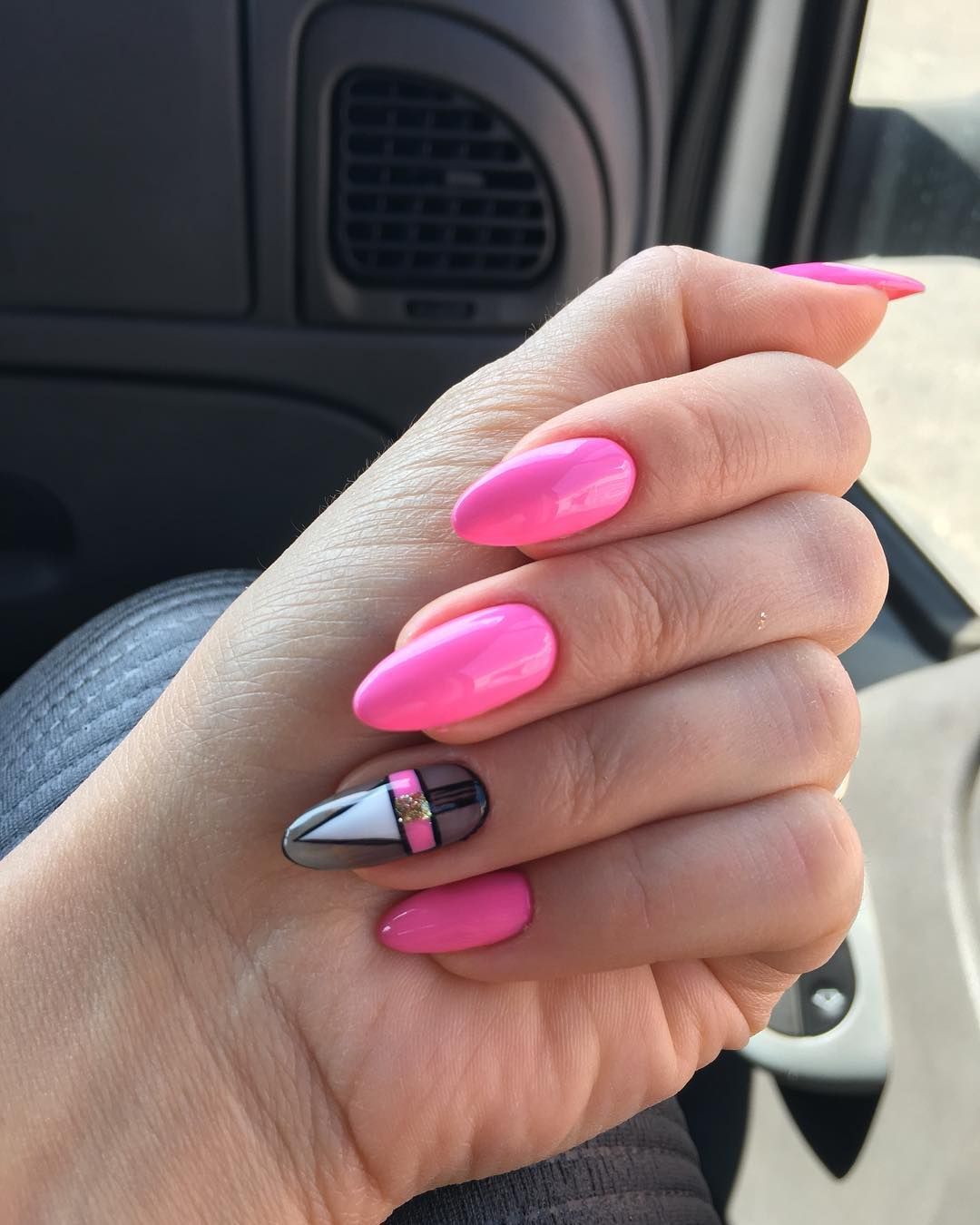 Идеи с использованием розового в качестве фона, черного для заполнения лунки на двух ногтях, желтого для блика в верхней части этих ногтей также крайне выигрышны. Его дополнят тонкие белые линии, расположившиеся параллельно друг другу в центре ногтевой пластины – вертикально или горизонтально.