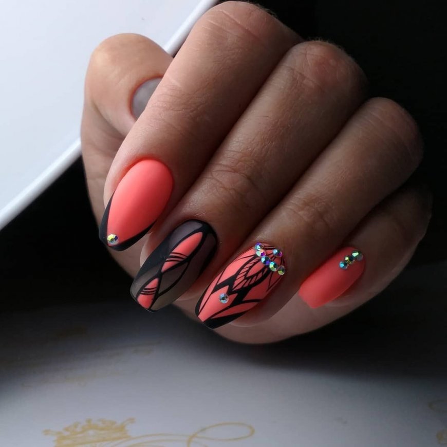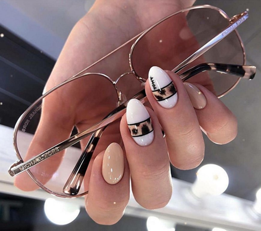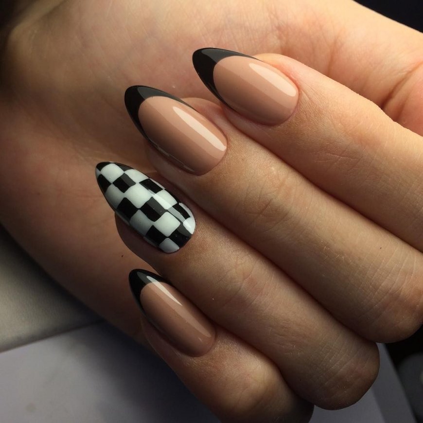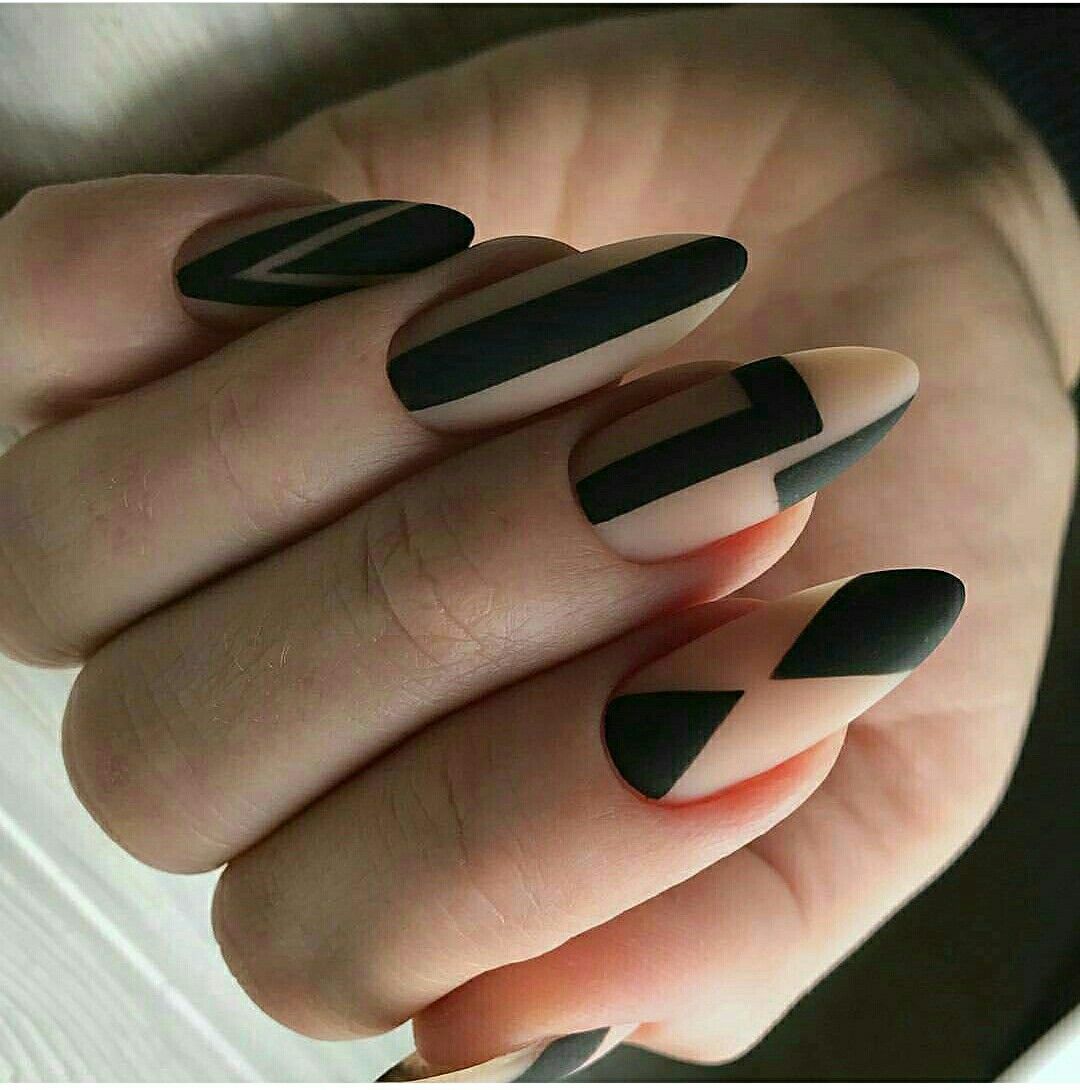 Геометрический рисунок — один из лучших способов продемонстрировать длинные нарощенные ногти. У вас будет достаточно места, чтобы использовать контрастные формы, цвета и узоры. Обязательно используйте два контрастных цвета — например, черный и телесный, чтобы резкие узоры выделялись.