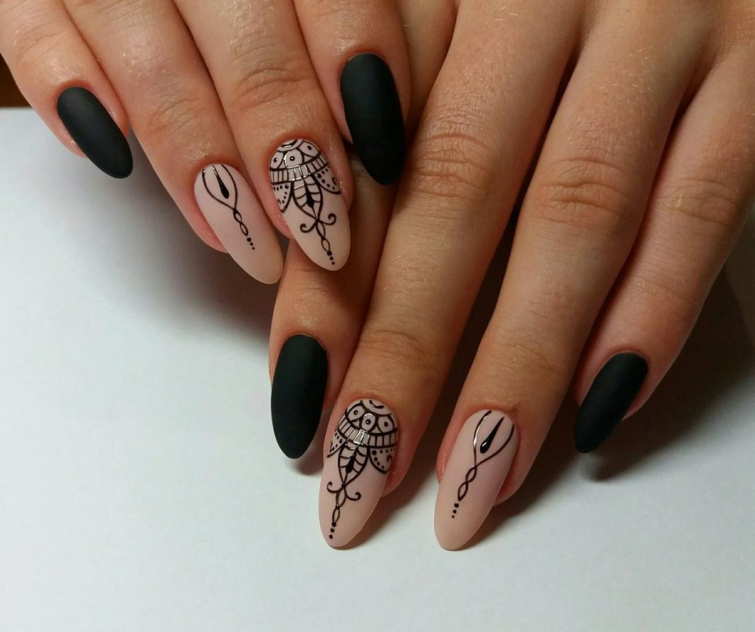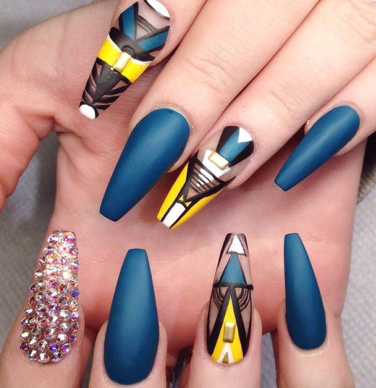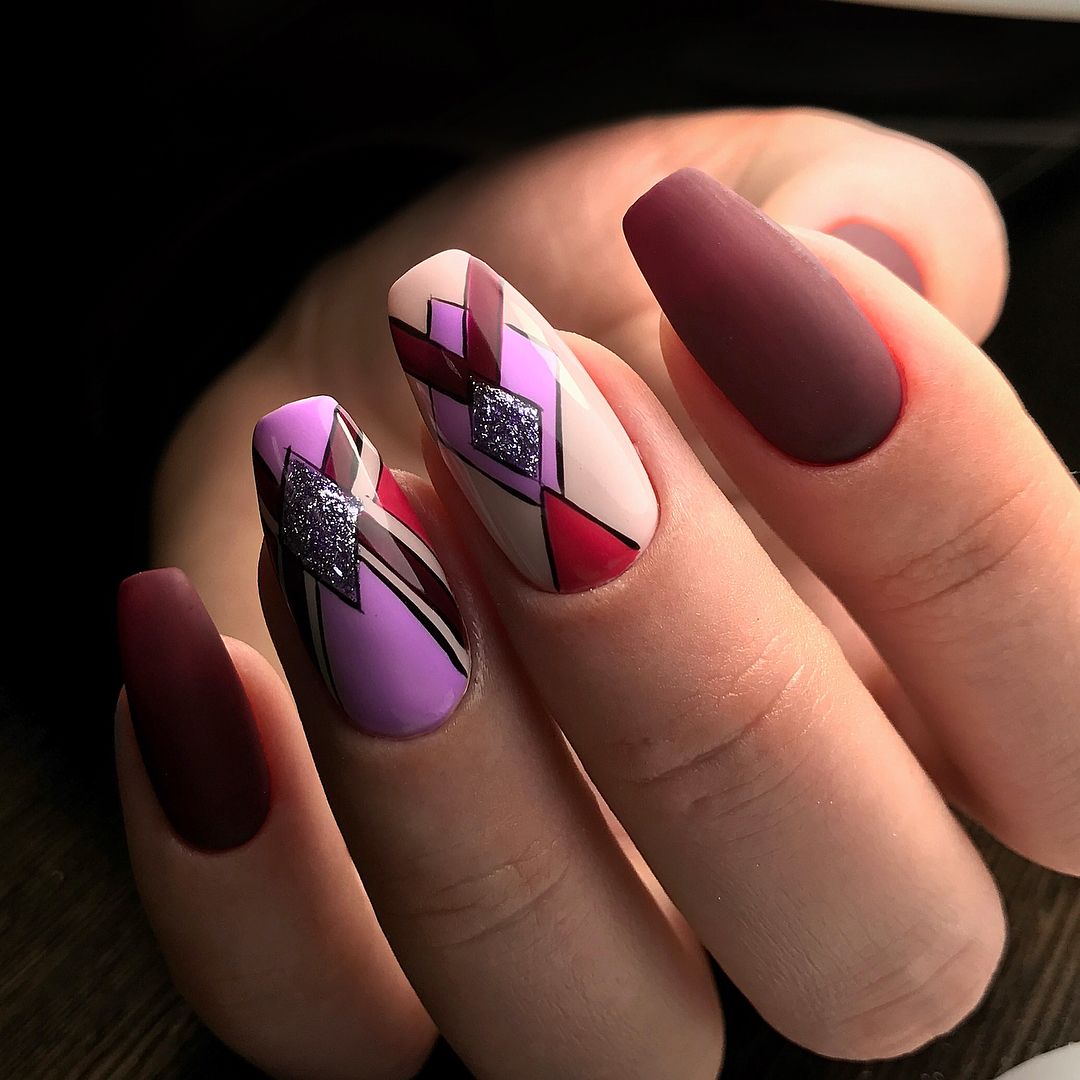 Геометрический рисунок — один из лучших способов продемонстрировать длинные нарощенные ногти. У вас будет достаточно места, чтобы использовать контрастные формы, цвета и узоры. Обязательно используйте два контрастных цвета — например, черный и телесный, чтобы резкие узоры выделялись.