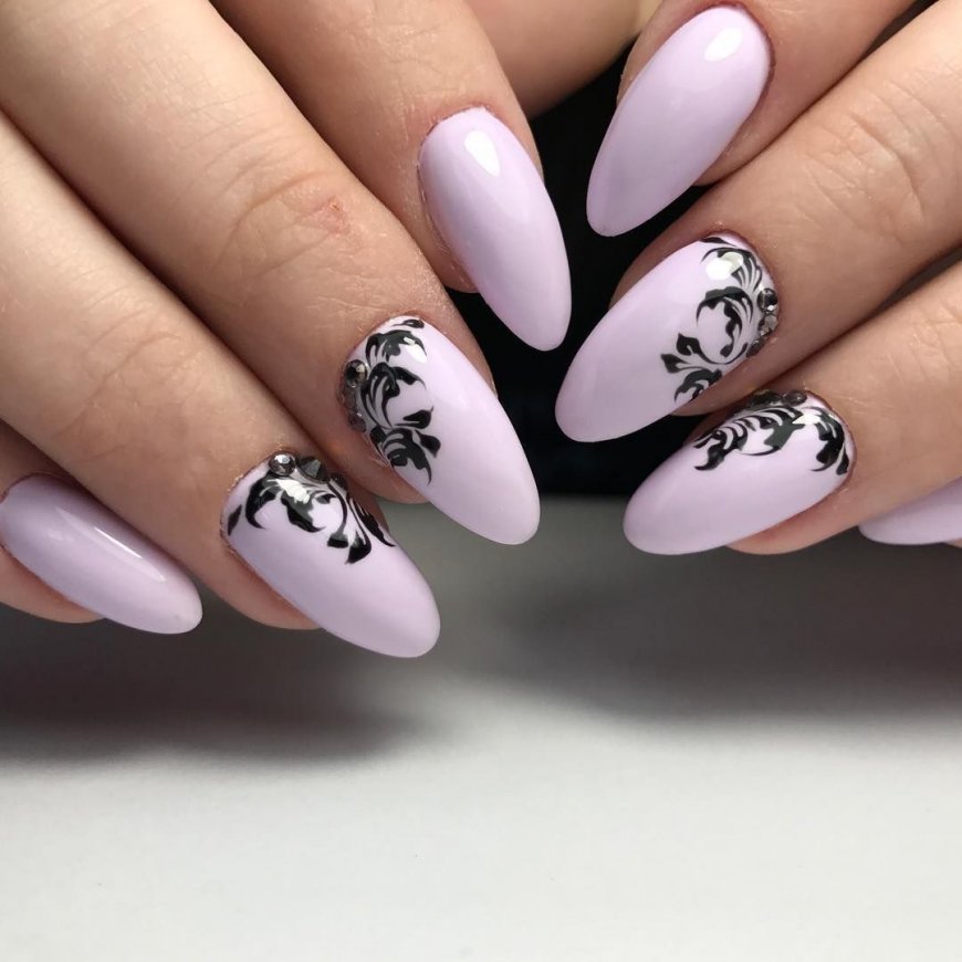 Стразы лучше выбрать разного размера, чтобы хорошо выглядели на длинных ногтях. Не менее актуален бело-лиловый градиент, выполненный с использованием глянцевого покрытия. Декор не нужен – одинаковое окрашивание на всех ногтях его не предполагает.