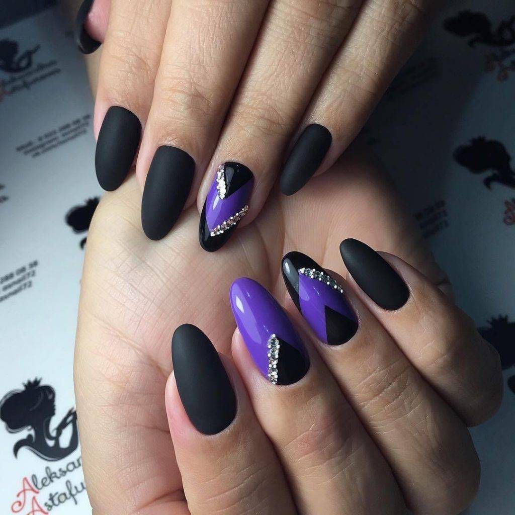 Длинные ногти могут быть окрашены в 2021-2022 в технике градиента. Самые трендовые сочетания – черный и темно-синий, фиолетовый. Они гармонично смотрятся и без дополнительного декора, однако могут быть украшены группой стразов, расположившейся на одном из ногтей у основания.