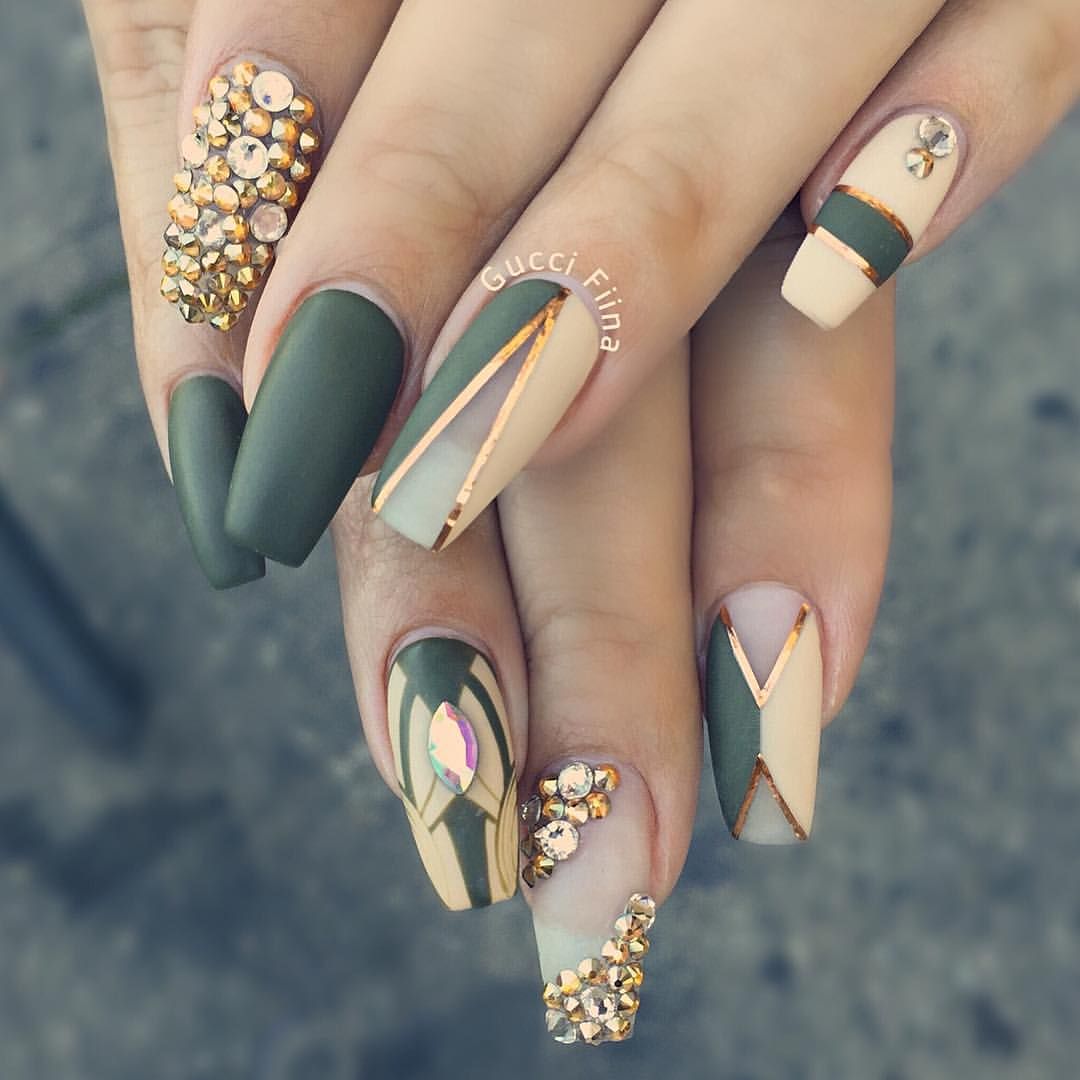 А как великолепно выглядит изумрудный маникюр в матовом исполнении, если его дополнить стразами и блеском будет очень красиво. Как вариант вечернего дизайна темно зеленый маникюр идеален в любом случае.