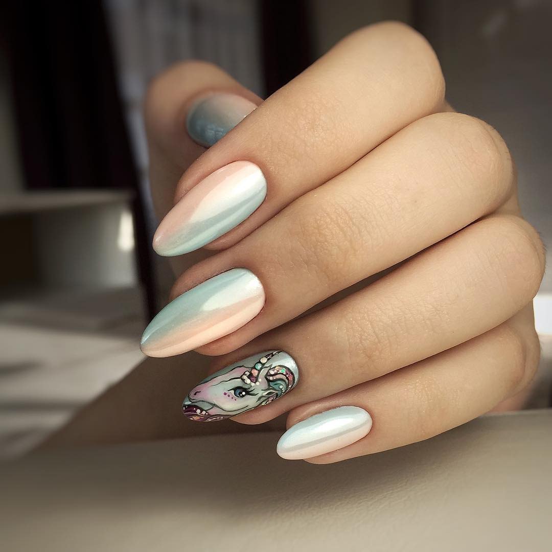 Что касается покрытия ногтя, то тут рекомендуется использовать либо цвета пастельных тонов, либо сочетания сочных оттенков цветов.