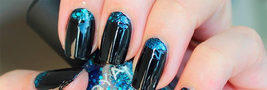 Отличная идея 2021-2022 для выполнения на коротких ногтях – черно-синий градиент, напоминающий ночное небо. Мелкие вкрапления блесток придадут такому маникюру загадочности, а отсутствие дополнительного декора – лаконичности.