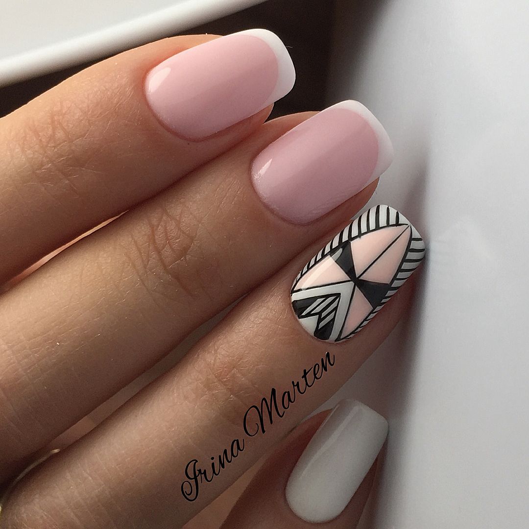 Точно таким же способом можно сделать на ноготке геометрический орнамент или узор, лунка при этом будет тоже нейтрального оттенка, хотя на неё можно нанести лак, подходящий по цвету.
