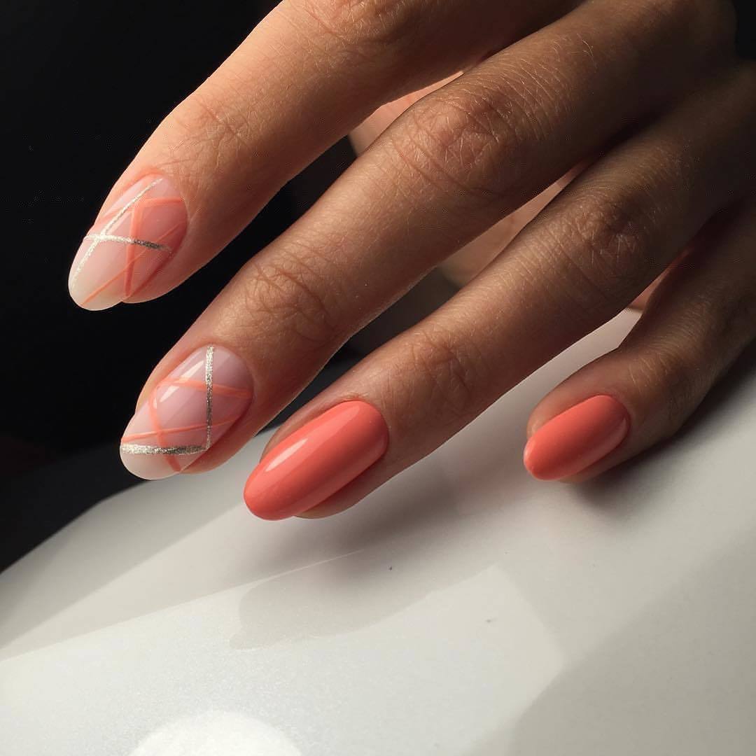 Интересен классический маникюр – глянцевое покрытие кораллового цвета и бежевого цвета. Стразы и блестки будут лишними – этот дизайн красив в своей простоте. Блеск лучше использовать в лунном маникюре, сочетающимся с френчем: ногтевая пластина оформляется розовым цветом, лунка – серебряным, свободный край – белым. На одном из ногтей может быть выполнен незамысловатый дизайн – белые линии, образующие пересечением треугольник, на одной руке и силуэт птицы на другой.