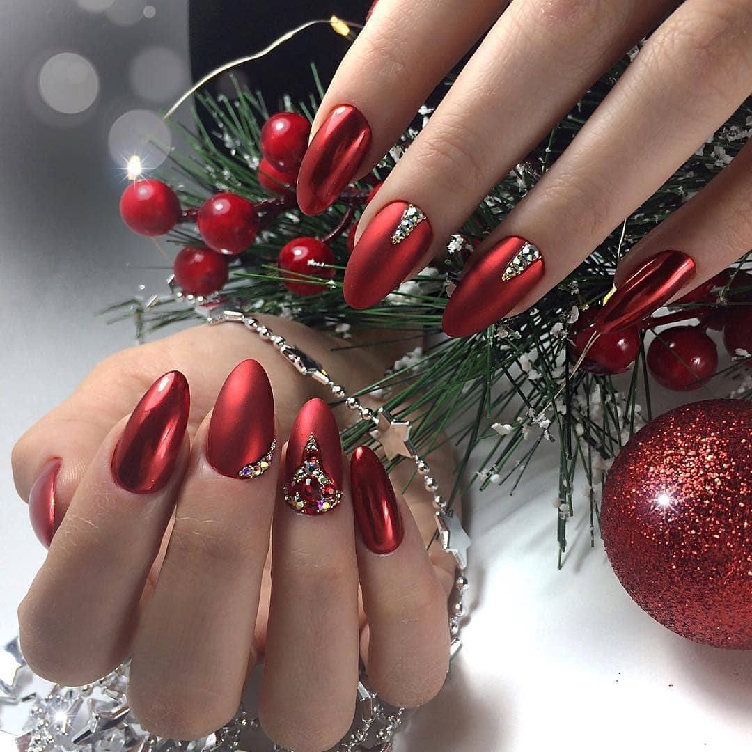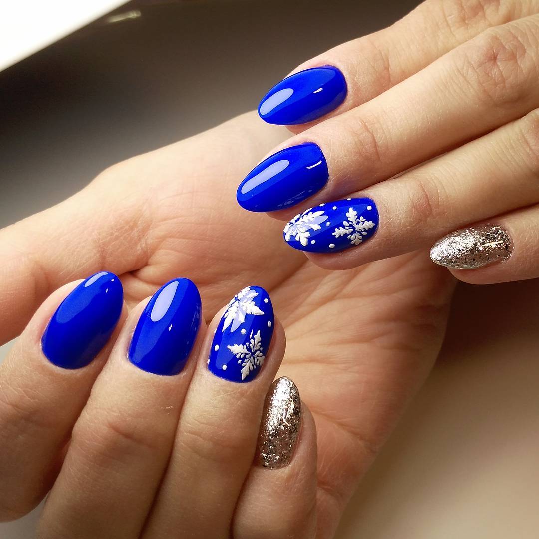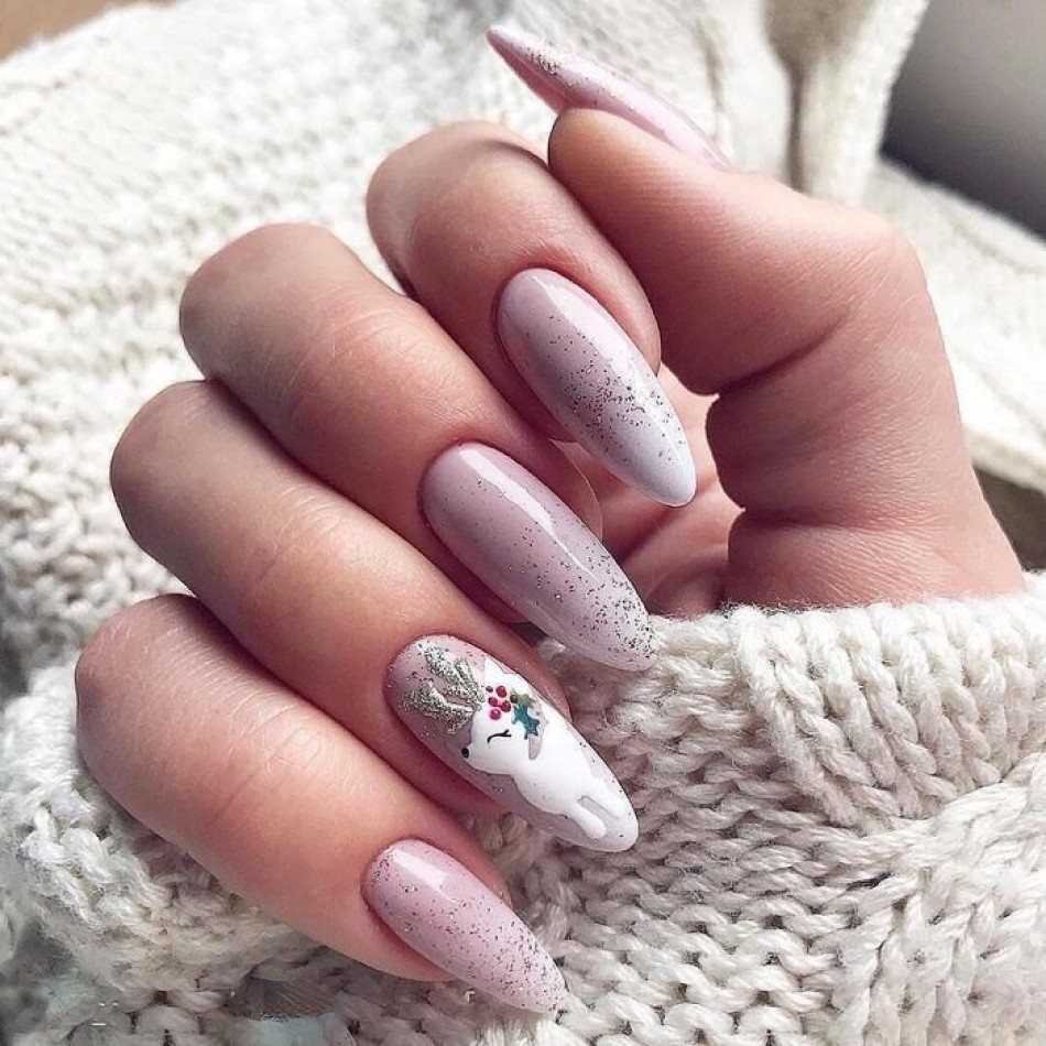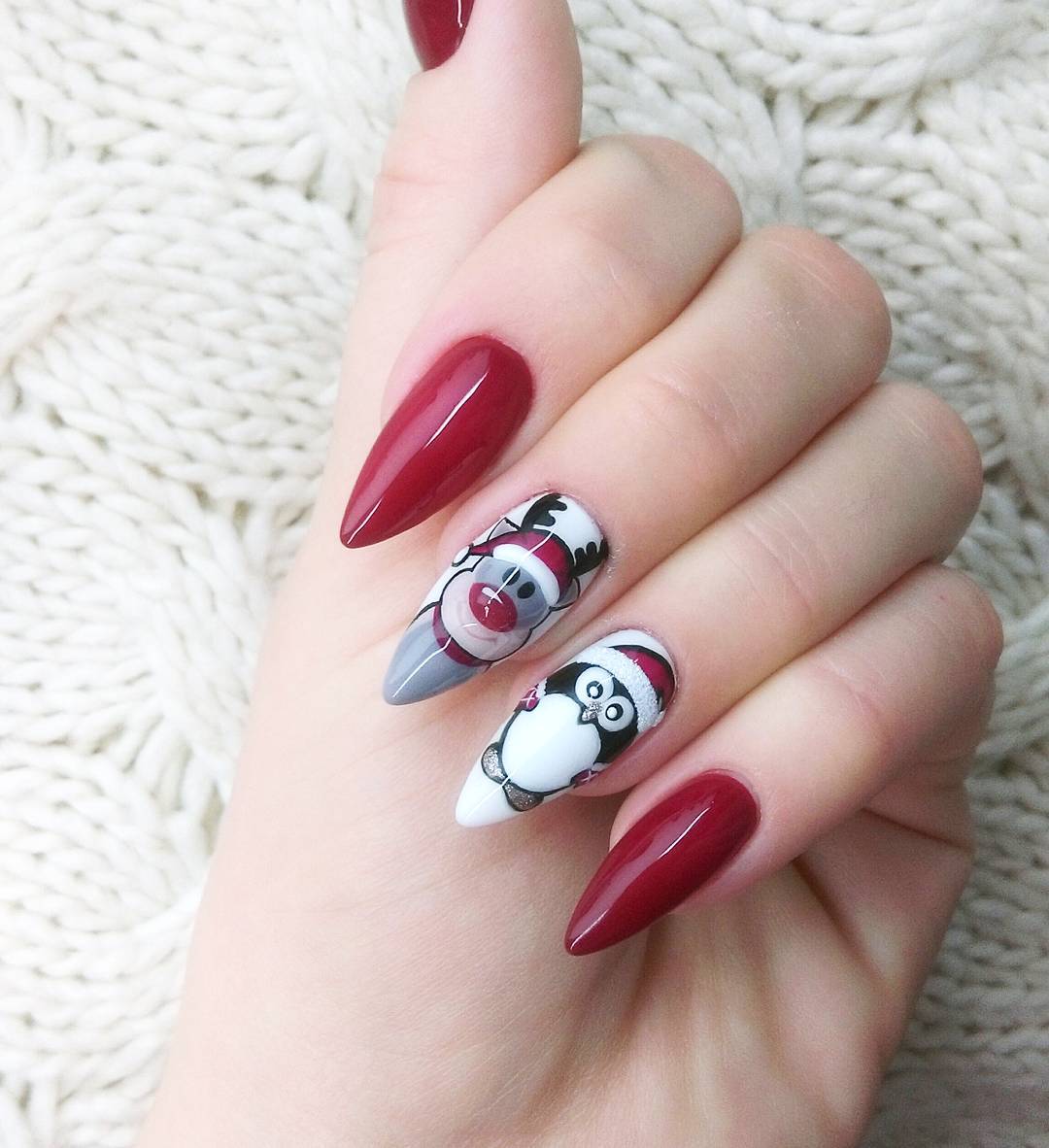 Для праздничного маникюра под тематику «Новый год» позволено выбирать любую форму для длинных ногтей. Все зависит от придуманного нейл-арта и техники маникюра. В тренде овальный запил ногтя, но и острые не теряют своей актуальности, если речь идет о праздничных или тематических видах оформления ноготков.