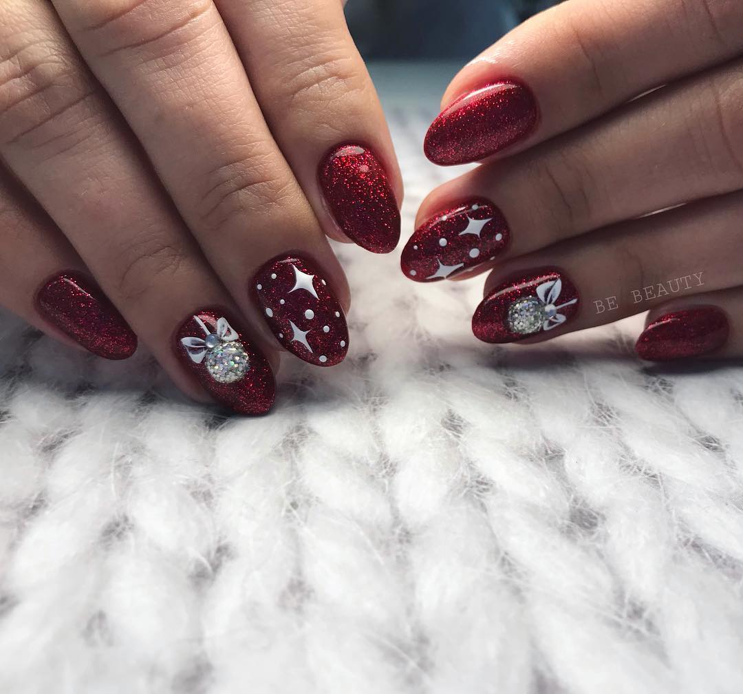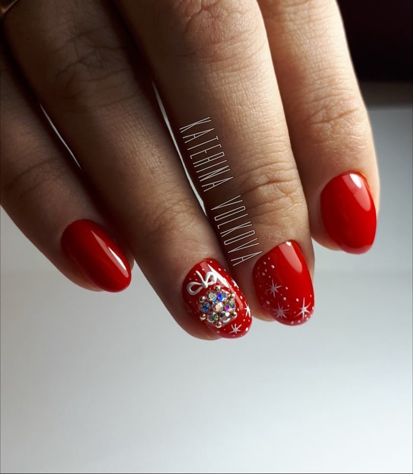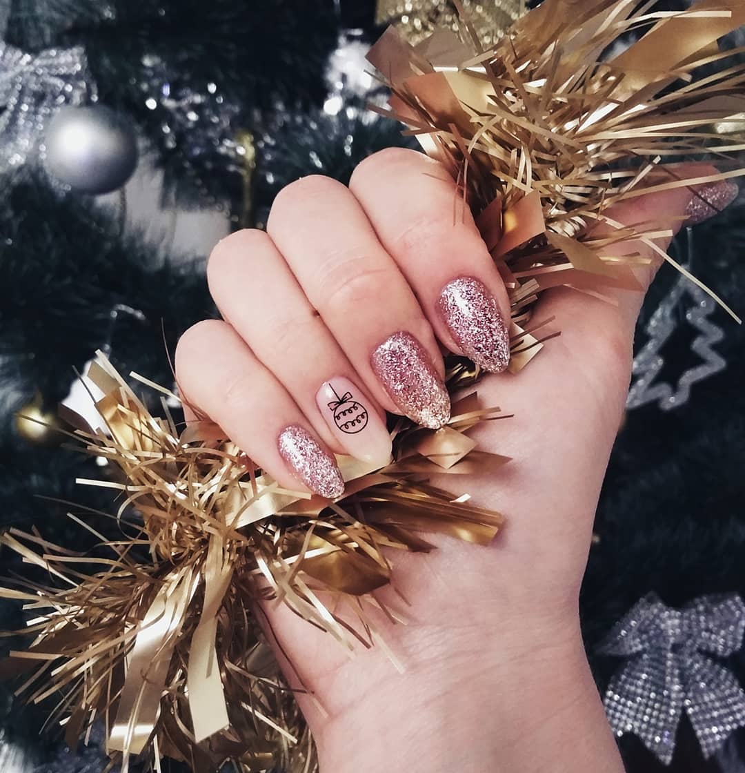 Для барышень с короткими ноготками мастера рекомендуют обратить внимание на новогодний маникюр без утяжеления, что означает использование в процессе оформления несложных узоров и рисунков, которые при наличии блестящих элементов не будут сливаться в одно пятно. Это может быть расположение декора на нескольких пальцах в виде скромной композиции из страз или новогодний рисунок с блёстками глиттера
