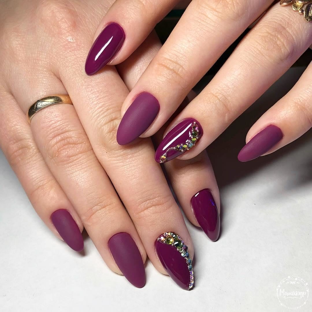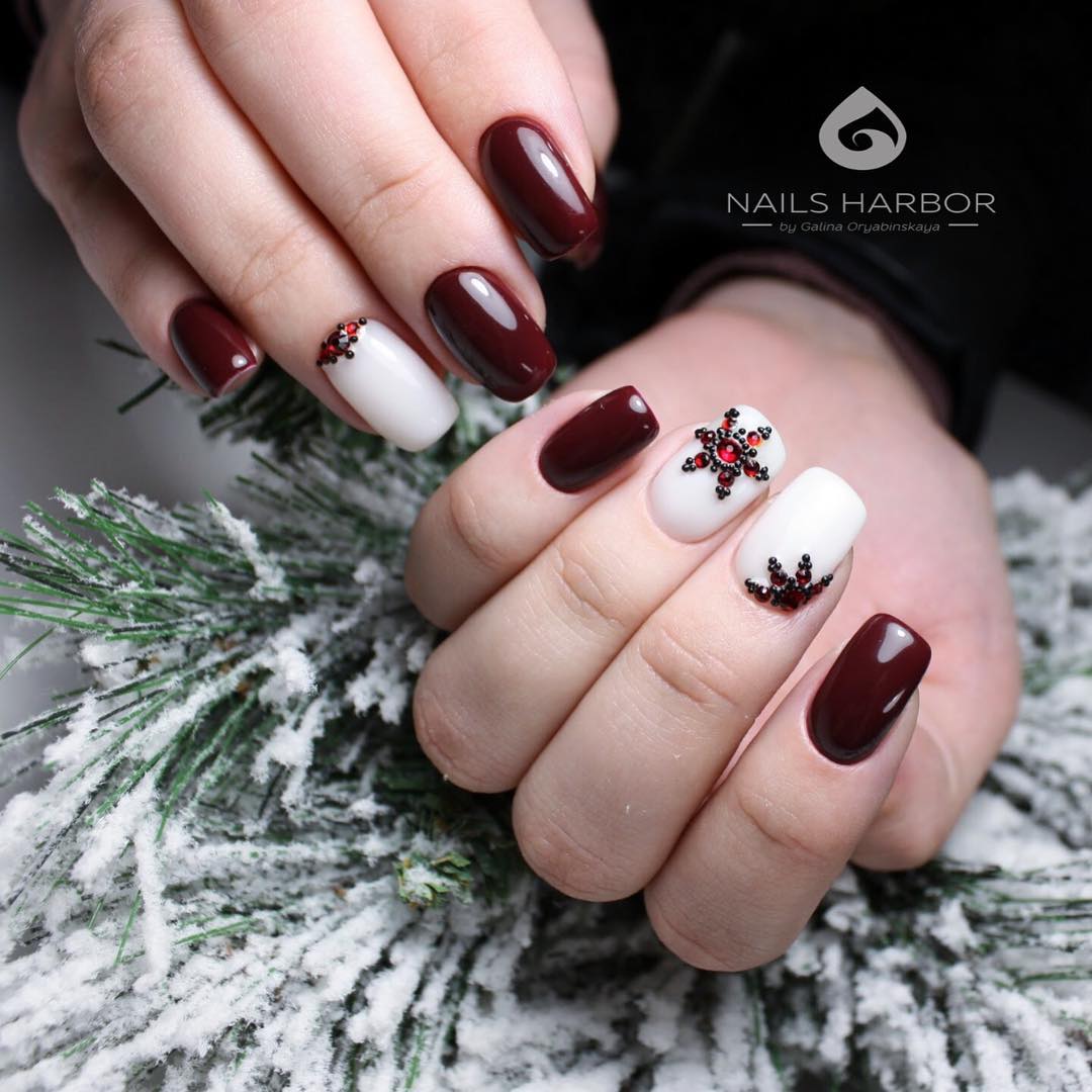 Эффектный бордо — вечная классика маникюра. Лучше всего на бордовом лаке смотрится контрастный дизайн в чёрной, золотой, серебряной и белой цветовой гамме. Отличным декором станут стразы и слюда.