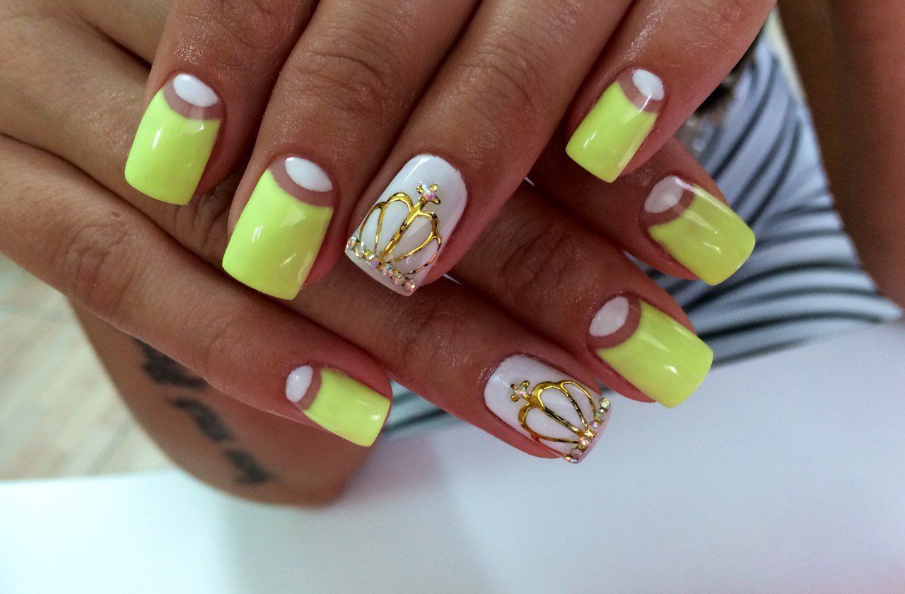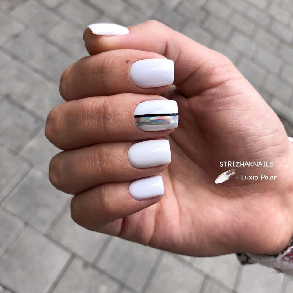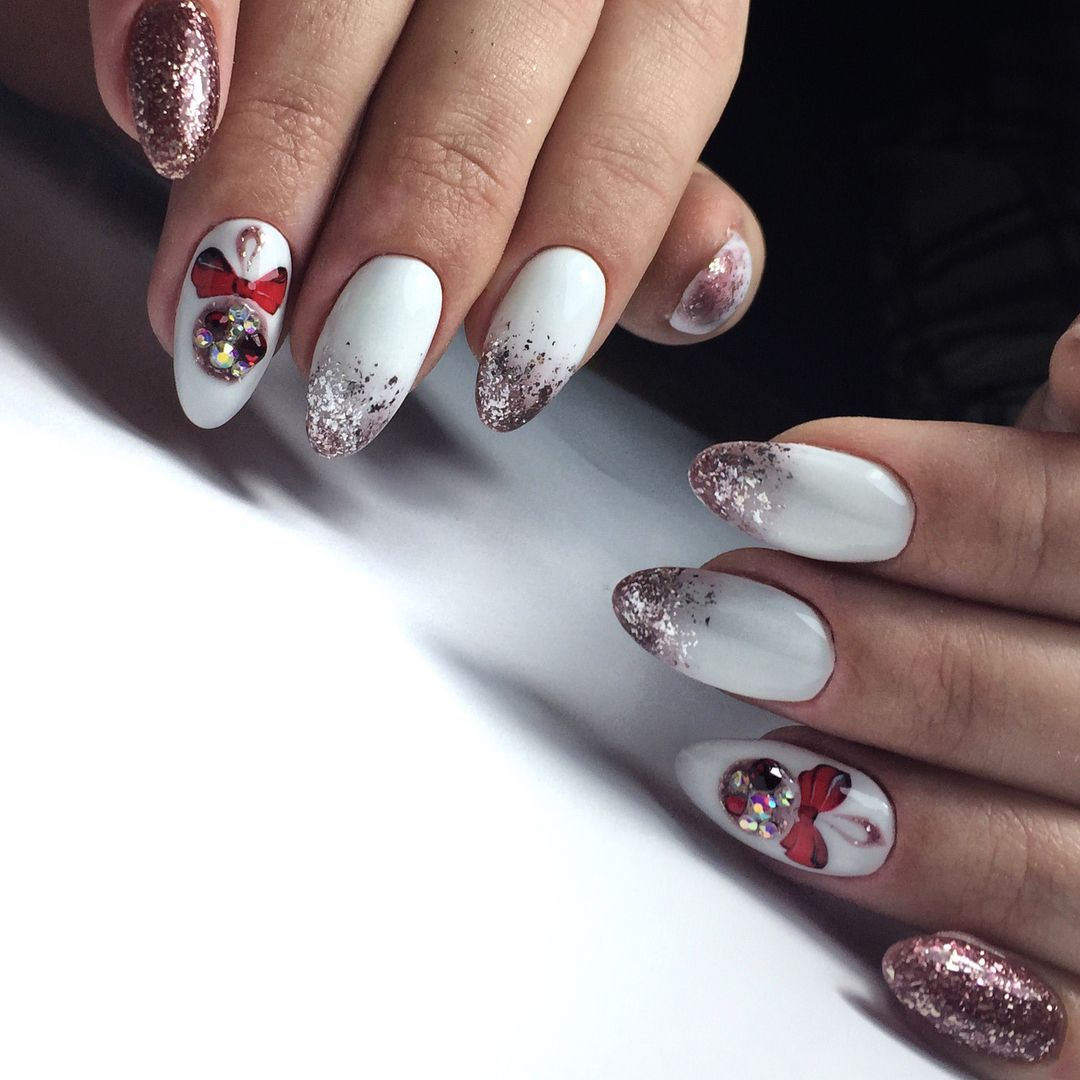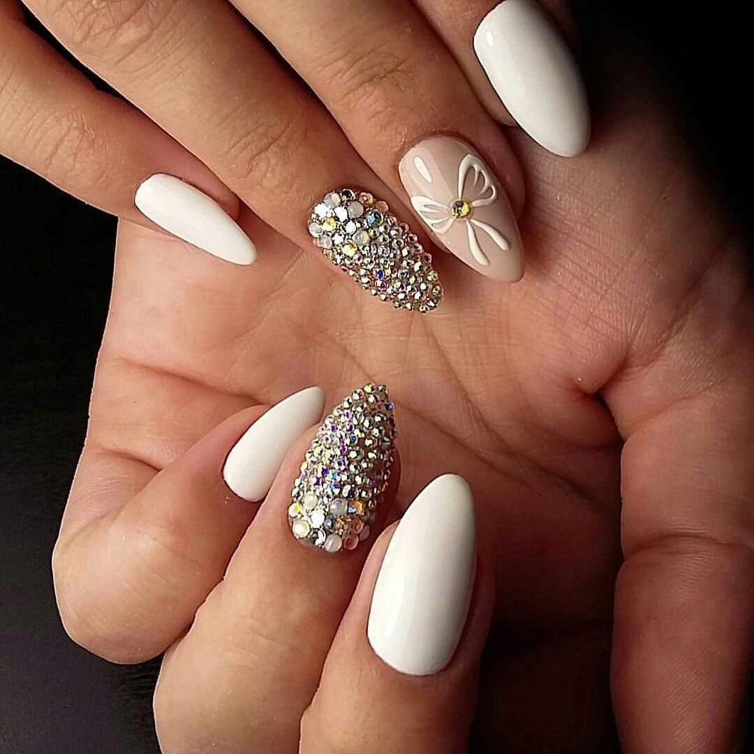 Белые и приближенные к нему нежные оттенки актуально использовать с контрастными цветами: красным, зеленым, синим, желтым и т.д. Для сохранения в маникюре нежности, можно подобрать декор, который по оттенку близок к фоновому покрытию.