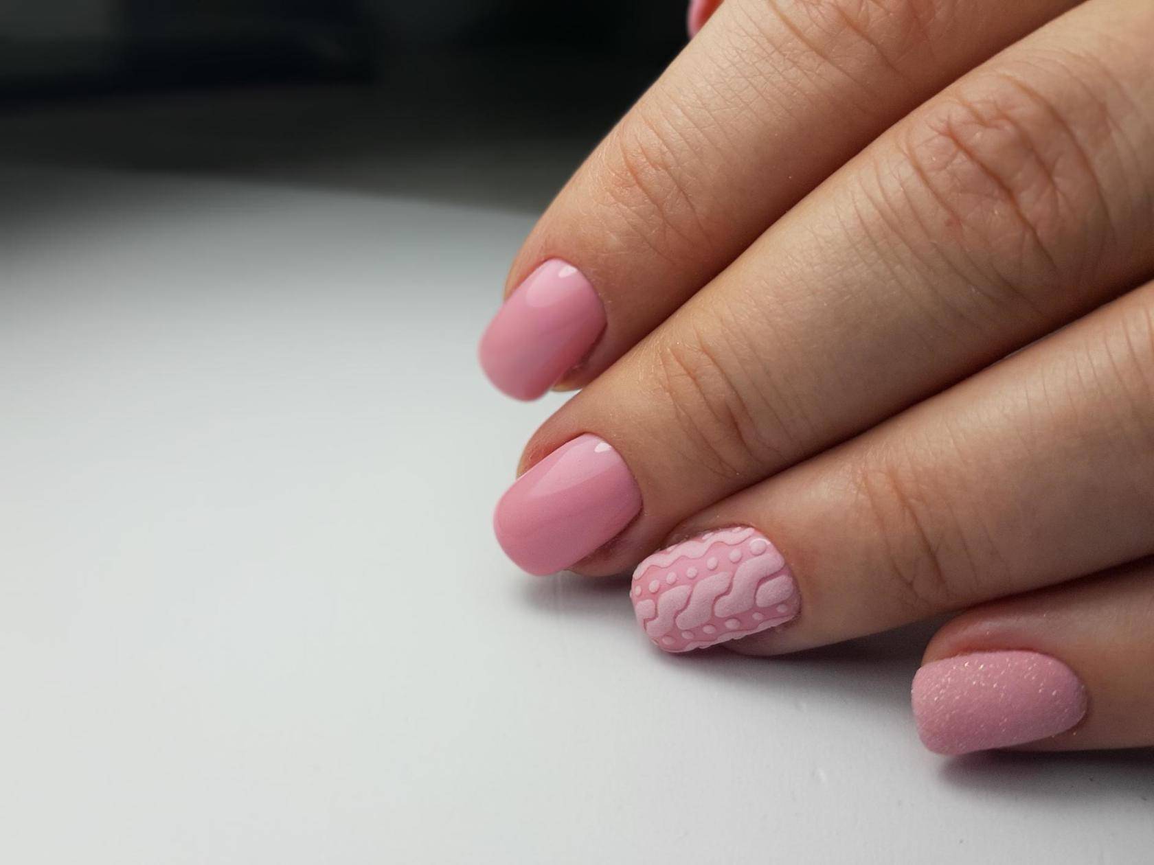 Очень эффектно смотрится «вязаный» маникюр в сочетании с матовым топом, втиркой или выделение блестящими деталями акцентного ноготка. Основное покрытие при этом может сочетать в себе несколько оттенков, которые гармонично дополнят выбранный наряд или выполнять в одном цвете.