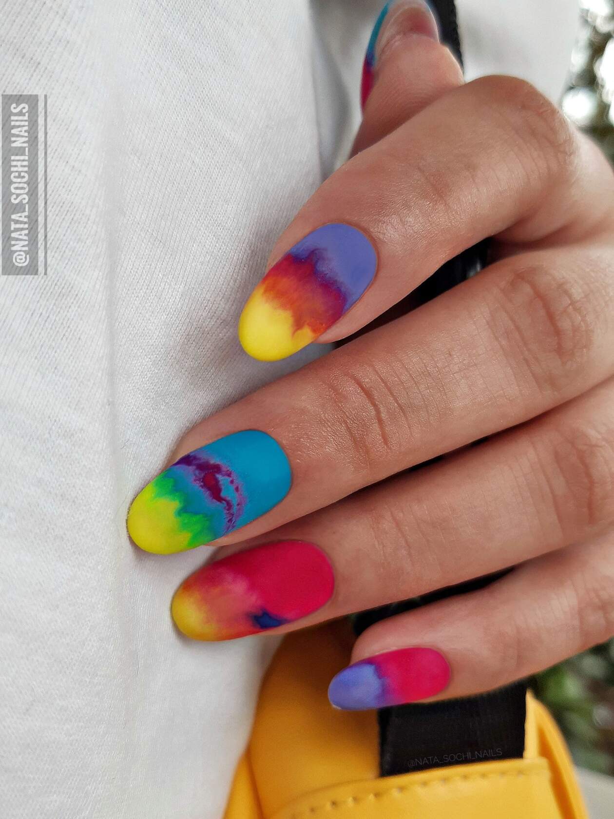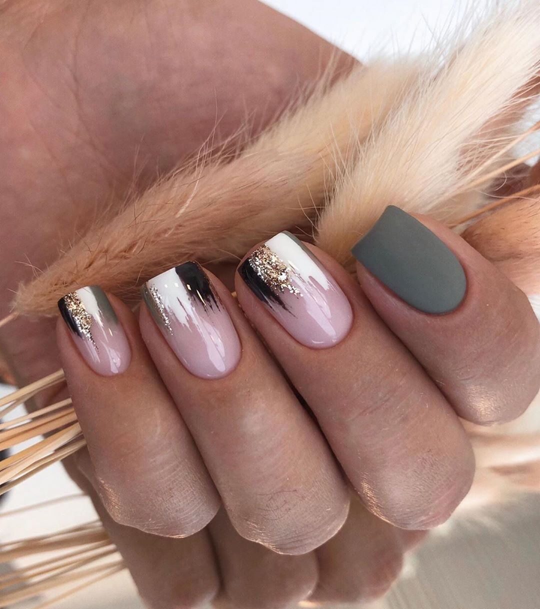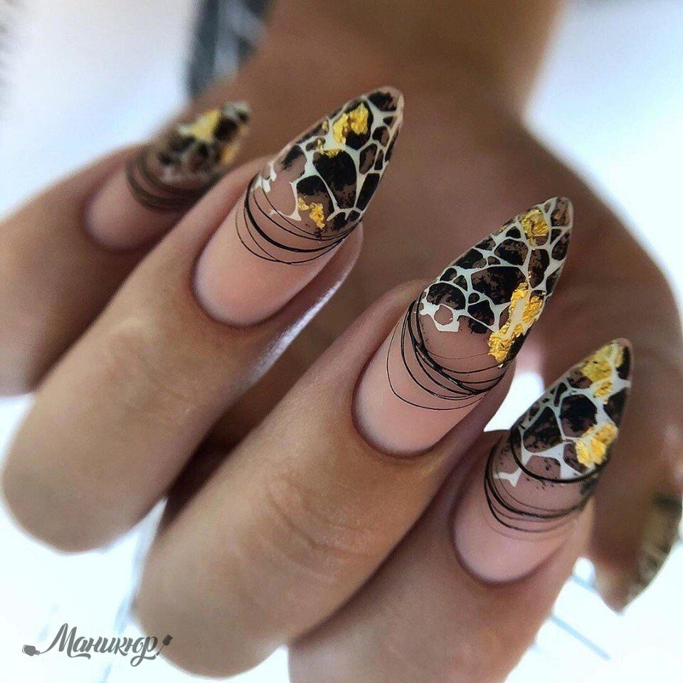 Еще одно стильное исполнение – нанесение разноцветной фольги на камуфляжное покрытие в виде хаотичных мазков. Такой дизайн делайте на 1-2 пальца, остальные окрасьте в яркий цвет.