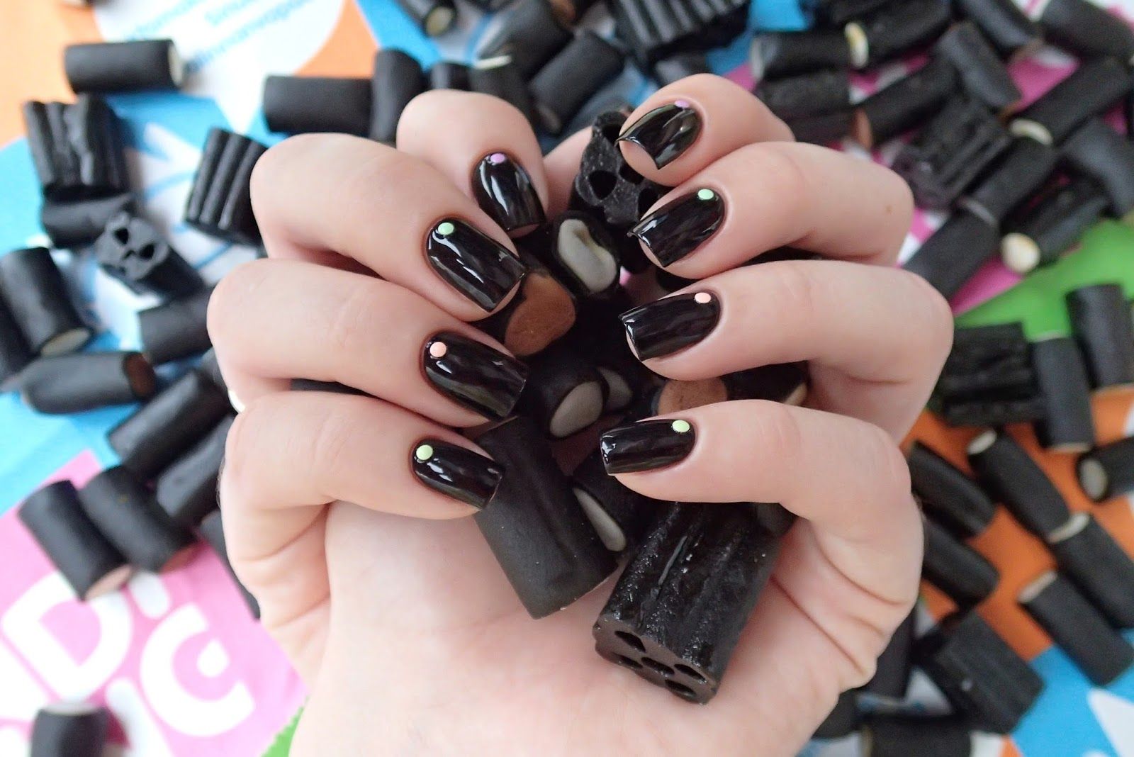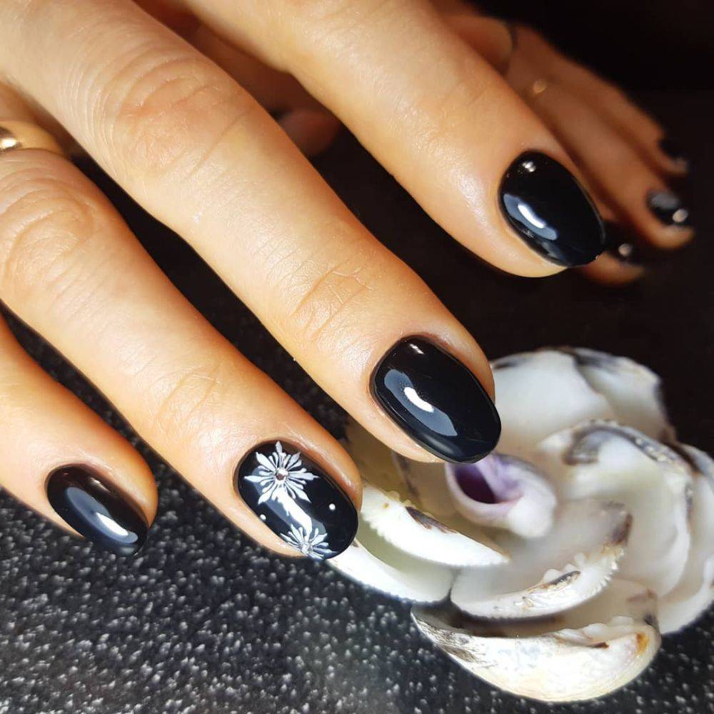 Черный цвет лака для маникюра особенно популярен в этом году, так как на темном покрытии очень броско смотрятся новогодние элементы декора, рисунки и принты. Подойдите серьезно к выбору новогоднего рисунка, ведь абсолютно неуместны в снежную погоду цветочки на ноготочках. Куда больше подойдут новогодние тематики, например: веселый снеговик, изящная снежинка, морозный орнамент, новогодняя зеленая елочка-красавица.