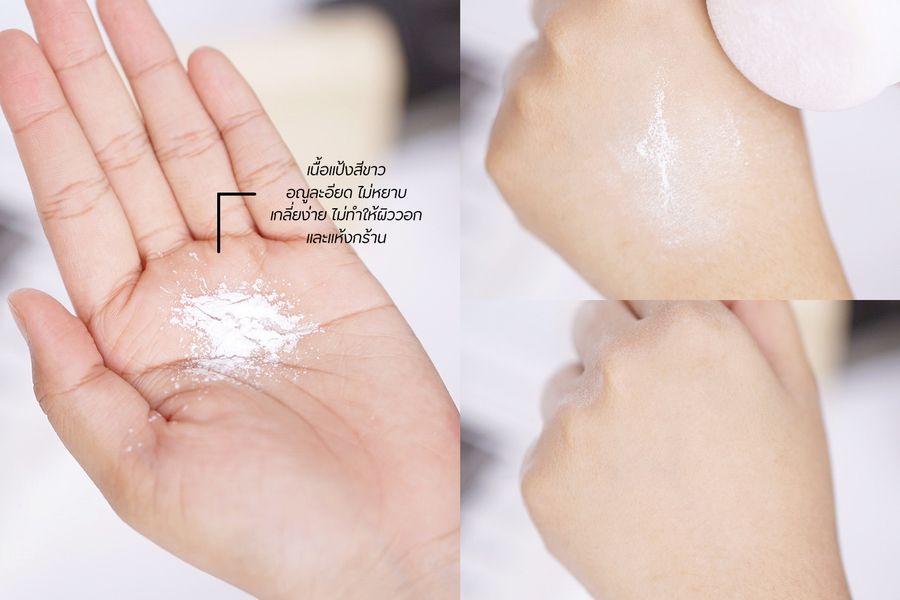 เนื้อสัมผัส : พูดตรงๆ เลยว่า เนื้อแป้งของเขาบางเบามากไป แป้งสีขาว อณูละเอียด เกลี่ยง่าย เบลนด์เข้ากับผิวได้ดี และถึงแม้แป้งจะสีขาว แต่พอทาลงไปที่ผิวแล้ว ไม่วอกค่ะคุณ! คือกลืนไปกับผิว พร้อมปรับผิวให้ดูเนียนกรุบ สุดปัง!