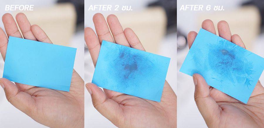 ครั้งนี้เราทดสอบคุมมัน 6 ชั่วโมง ไม่มีการเติมแป้งระหว่างวัน ถ้าดูดีๆ ความมันช่วง 2 ชั่วโมง ยังเบาอยู่เลยนะ คือมีบ้างนิดหน่อย แต่น้อยมาก หลังจากนั้นผ่านไปอีก 6 ชั่วโมง ช่วงทีโซนเริ่มมันขึ้น แต่ไม่ได้เยอะอะไร ซับความมันออกมาได้ประมาณนี้ ถือว่าโอเคเลย เราว่าคนผิวมันใช้แล้วชอบแน่นอน