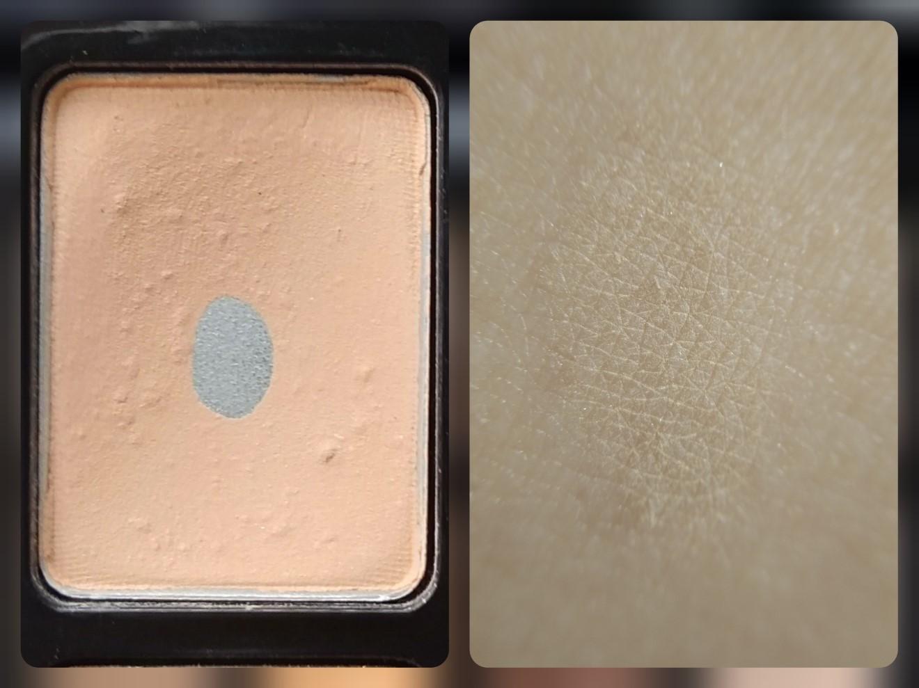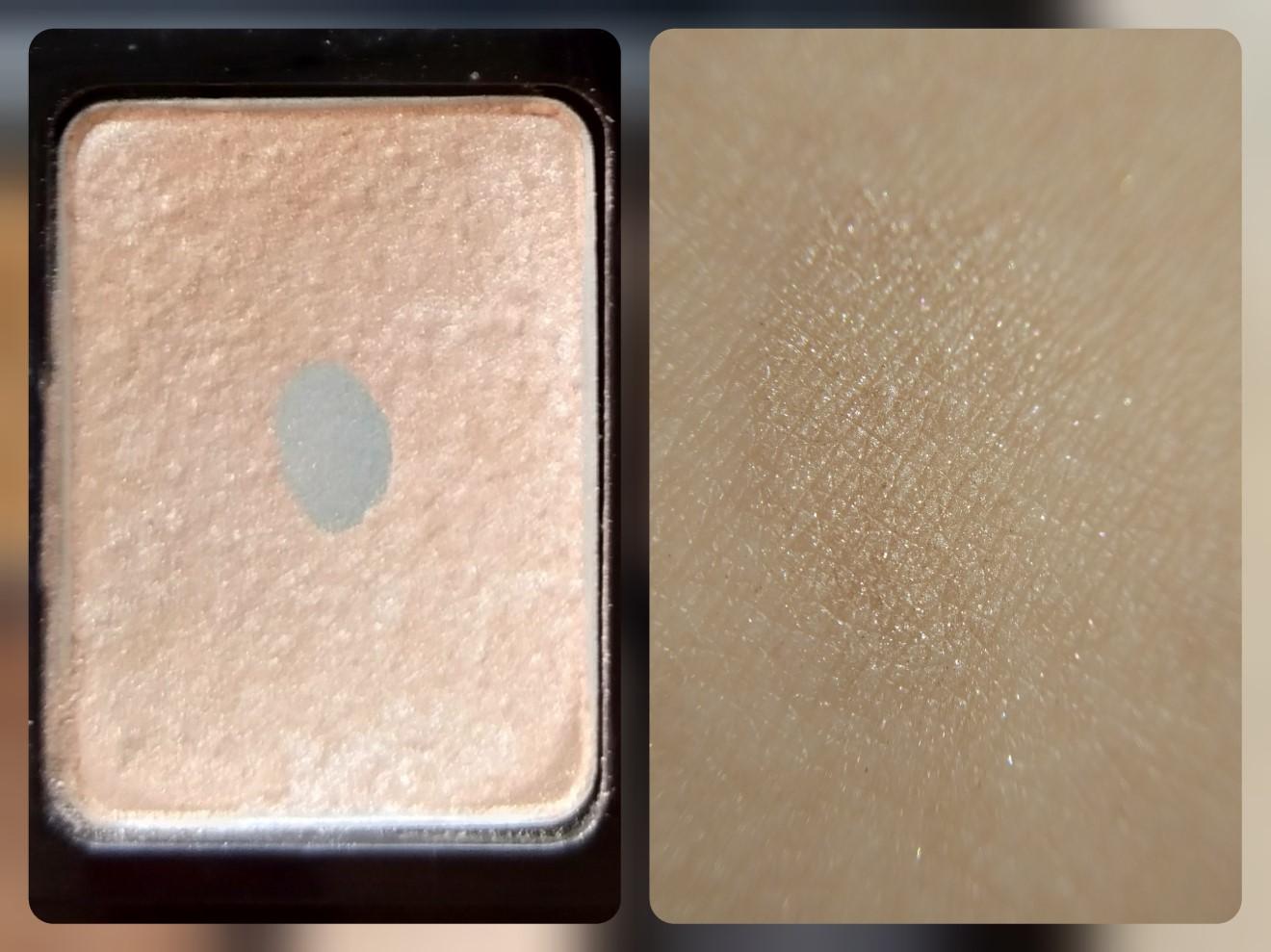 Оттенок #1 в палитре теней можно назвать шиммерным – невооружённым взглядом заметны голубовато-зеленые переливающиеся крупные частицы. Основа – интерферирующий перламутр с оранжево-розовым отливом, цвета как такового не имеет, прозрачна при нанесении, заметны лишь блёстки и перелив. Текстура очень легко захватывается аппликатором, даже с излишком.