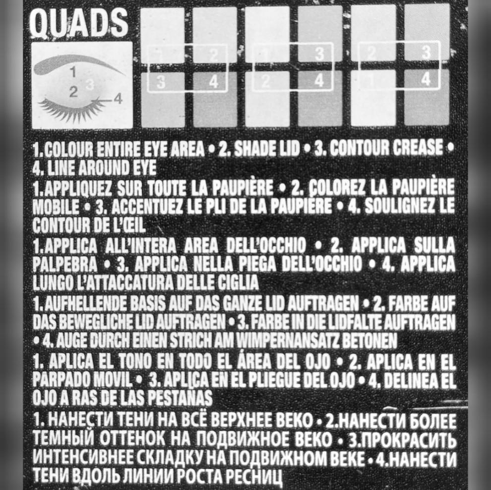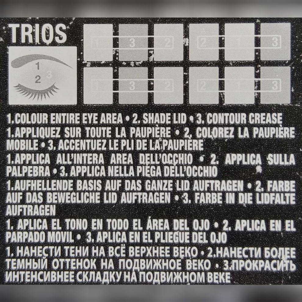 Для меня как для начинающего визажиста-самоучки интересно получить какую-либо информацию о сочетании оттенков, способах нанесения. Особенно приятно, когда производитель на обратной стороне коробочки с тенями разместил свои рекомендации по созданию макияжа с помощью четвёрок, троек и пар оттенков. Также удобно то, что оттенки заботливо пронумерованы – не приходится угадывать, остаётся лишь наложить тени на нужные области век.