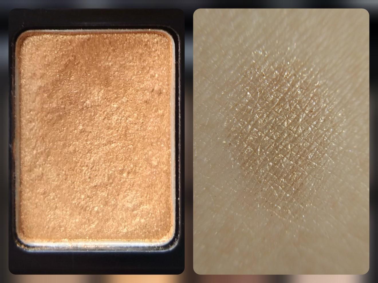 Оттенок #3 я бы назвала “розовое золото”, так как в своей основе он имеет розовато-коричневый цвет, а вот блёстки, дающие эффект перламутра, золотистого цвета. Интересное наблюдение: при неправильном нанесении на верхнее и особенно нижнее веко эти тени делают глаз воспаленно-красным, больным. Очень редко беру этот цвет в макияж, он сохранился почти нетронутым. Трудно набирается на аппликатор, плотный.