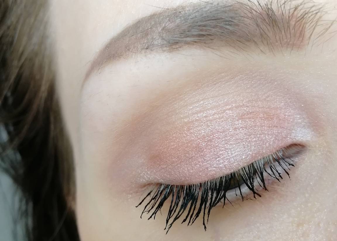 - Второй оттенок — холодный розовый. Оставляет на веке серебристый след с небольшим намеком на розовинку.