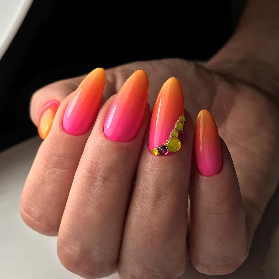 Такое цветовое исполнение очень актуально для летних новинок маникюра. Он получается очень ярким и сочным, и даёт прекрасную возможность разгуляться фантазии для выбора дизайна