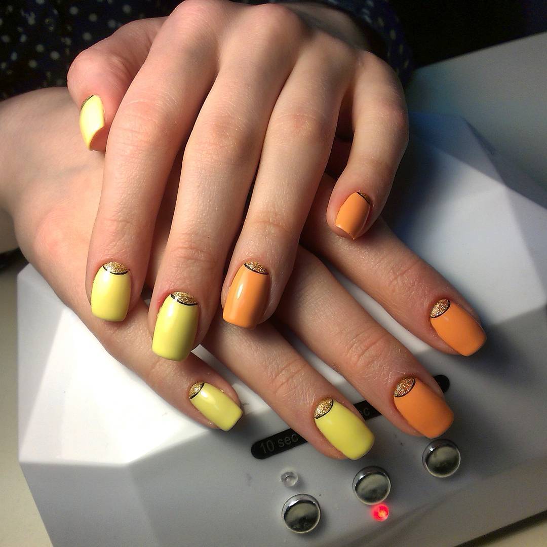 - Желто-оранжевый. Этот оттенок также нельзя ни с чем перепутать. Роскошно смотрится такой цвет в градиентном маникюре. Он позволяет создавать просто космические сочетания и переходы. Ни одна модница точно не останется равнодушной.