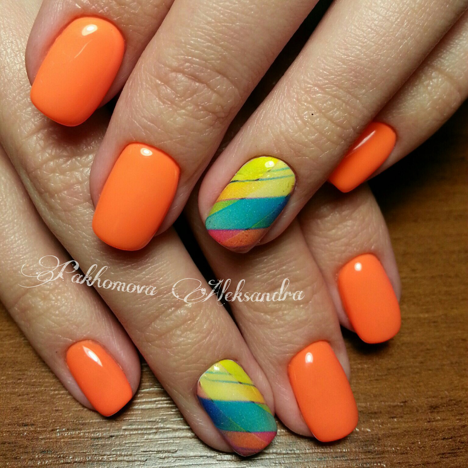 - Ярко-оранжевый. Такой маникюр — идеальный вариант для лета. Он яркий, сочный и по-настоящему летний. Кроме того, в данном оттенке можно воплотить множество интересных задумок касаемо дизайна.