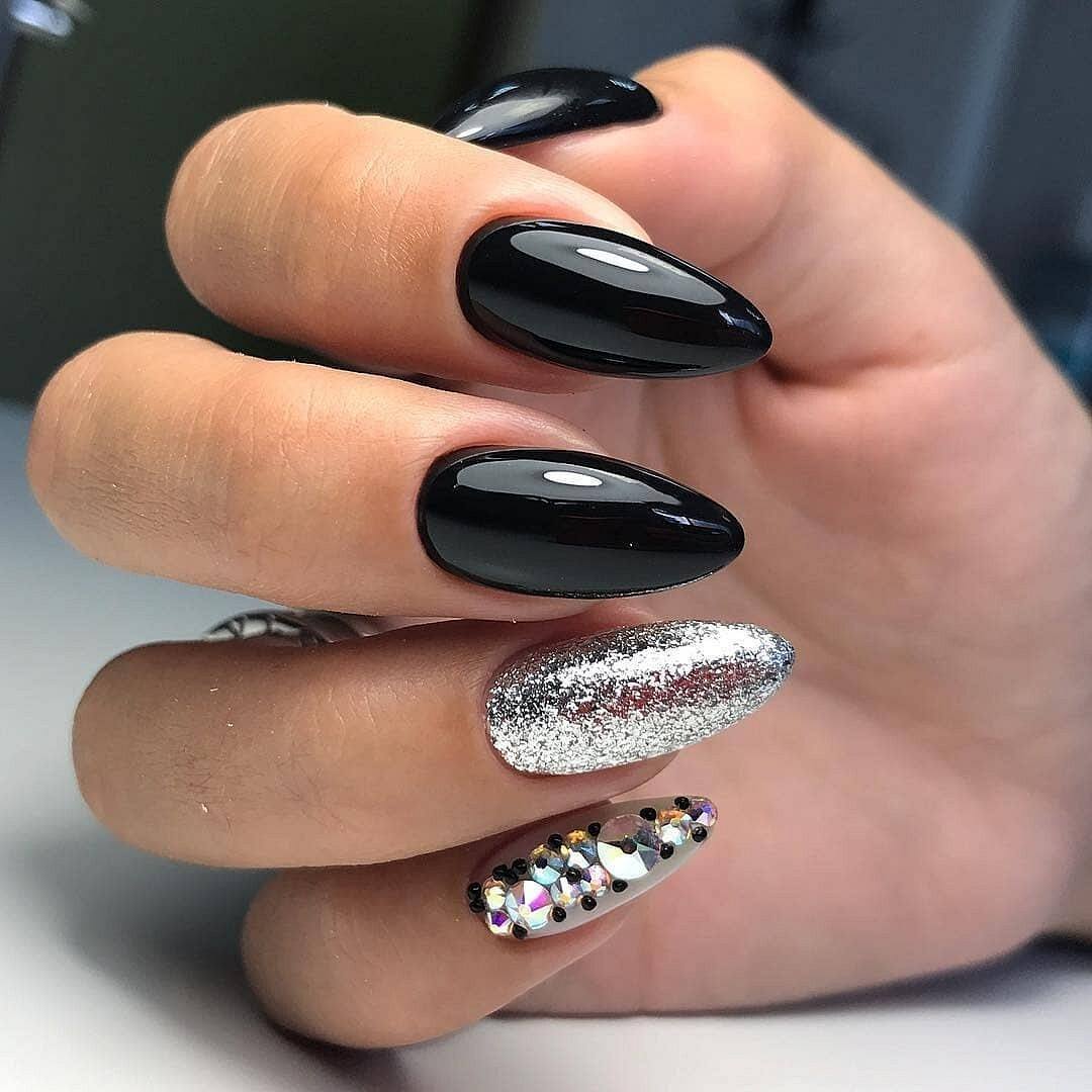 Черный маникюр с золотыми блестками и стразами для длинных ногтей