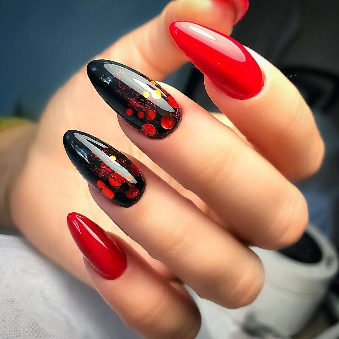 В повседневных образах шикарно смотрится дизайн с пайетками. Выбирайте черные или красные пайетки в зависимости от основного фона. Этот же дизайн отлично подойдет для новогоднего образа.