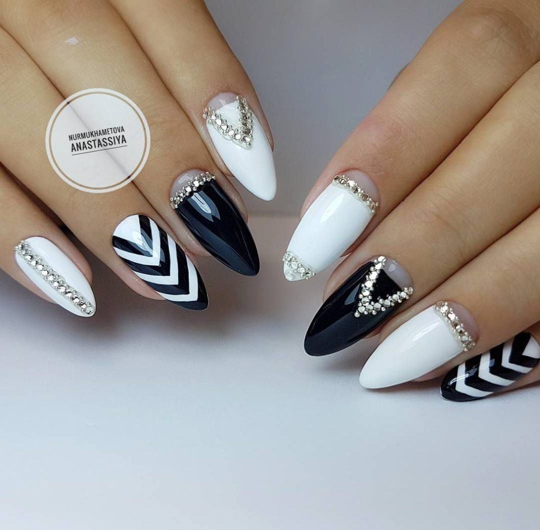Чтобы черный дизайн не выглядел столь категорично, можно разбавить его белым оттенком. В итоге вы получите шикарный объемный дизайн ногтей. Сочетаний черного и белого множество, но особой популярностью пользуются следующие нейл-арты: