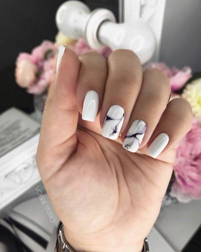 Дизайн, который напоминает переливающийся мрамор – это настоящий тренд этой осени. Мастера создают покрытие, которое будто покрыто настоящими трещинами на камне и, поверьте, это выглядит очень классно. Хорошо и то, что такой дизайн при своей привлекательности смотрится довольно изящно. Можно совместить мраморный дизайн с контрастным оттенком пары ногтей.