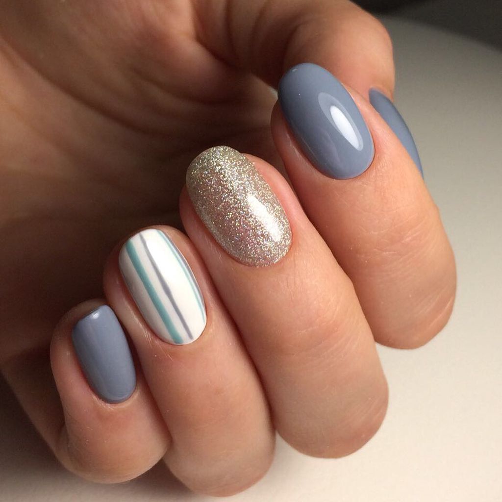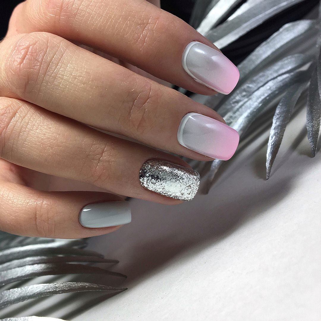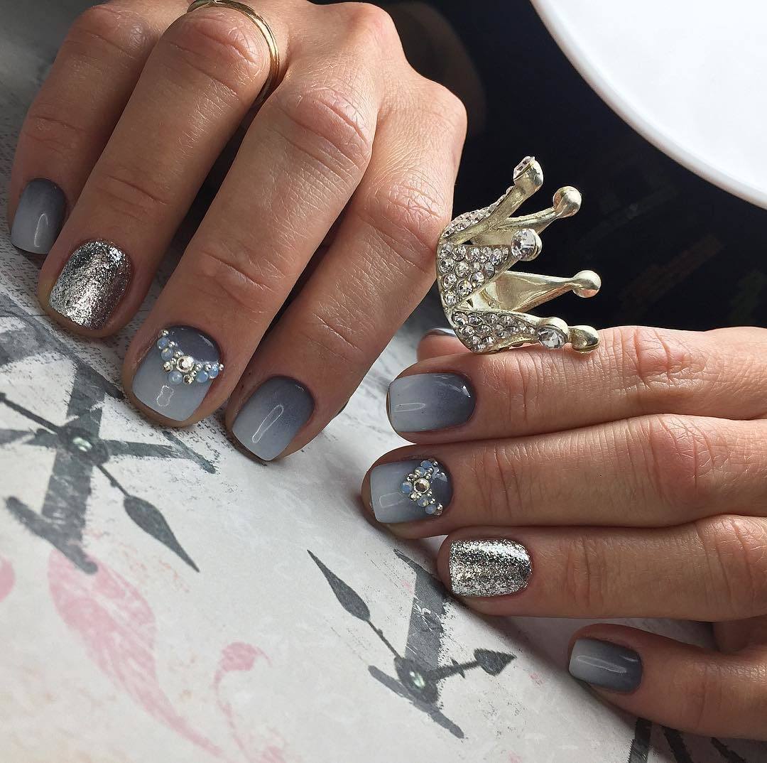 Спокойный серый цвет в сочетании с серебряными блестками — и вы получаете «рецепт» идеального маникюра.