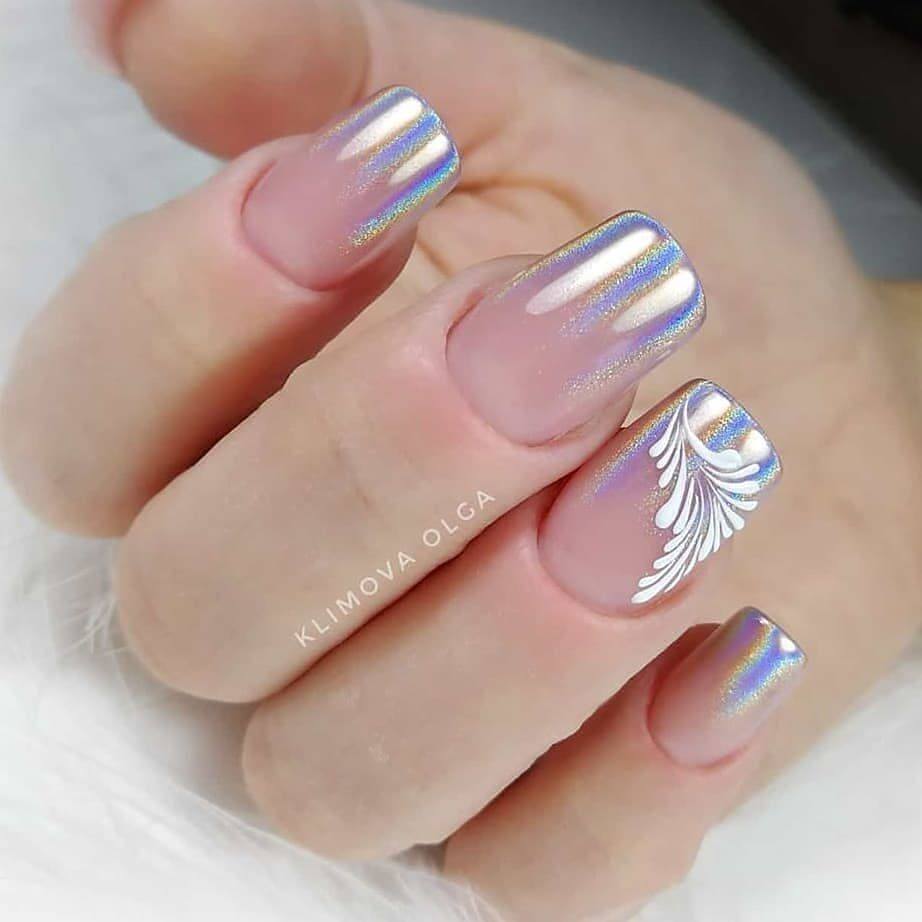 Очень часто представительницы прекрасного пола носят такой маникюр на повседневной основе. Для получения переливающегося эффекта применяется специальная пудра или же прозрачный глиттер.