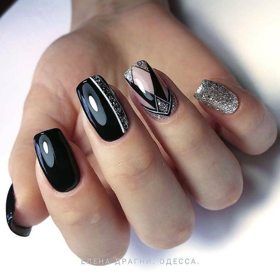 Матовый черный маникюр и серебренные блестки, ровняется идеальный маникюр. В отличие от обычного блестящего глянцевого дизайна ногтей, матовый ноготь сдержан, имеет особую текстуру, выглядит спокойным и благородным, элегантным и темпераментным.