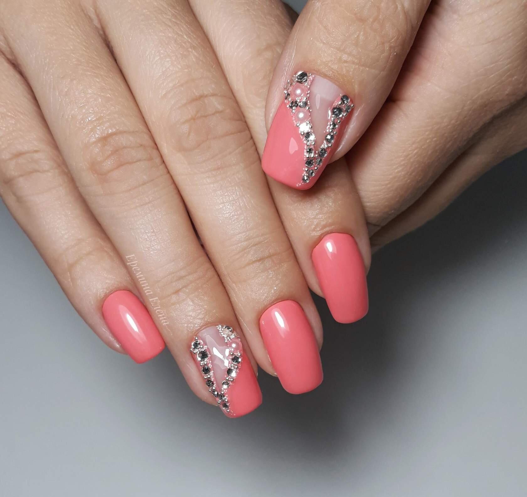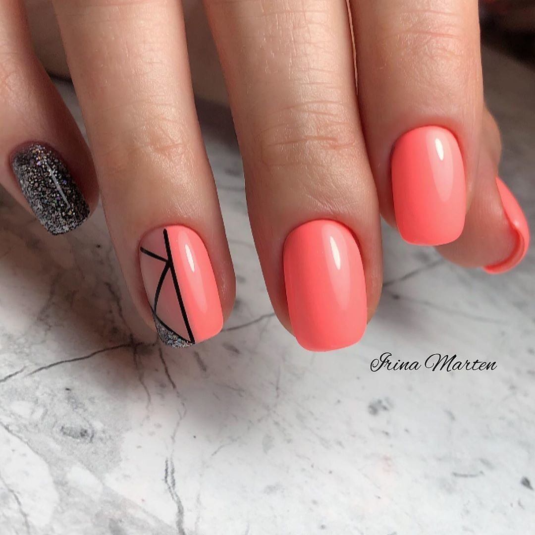 Розовый цвет лояльно относится абсолютно к любому декору. Это могут быть строгие геометрические формы, легкие летние узоры с фруктами, цветами. Все эти узоры можно дополнить гель-лаками с глиттером или окрасить 1-2 ноготка на руке сплошным слоем глиттера.