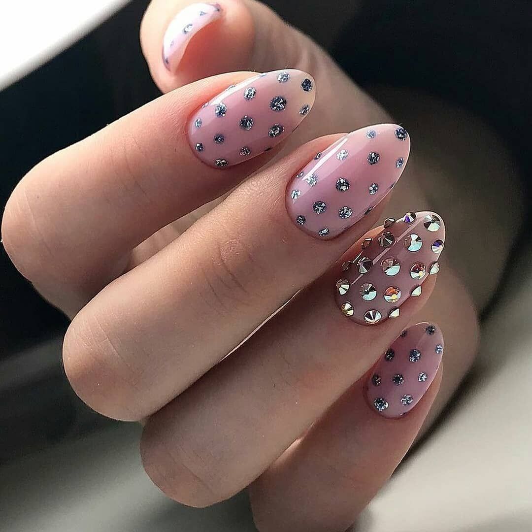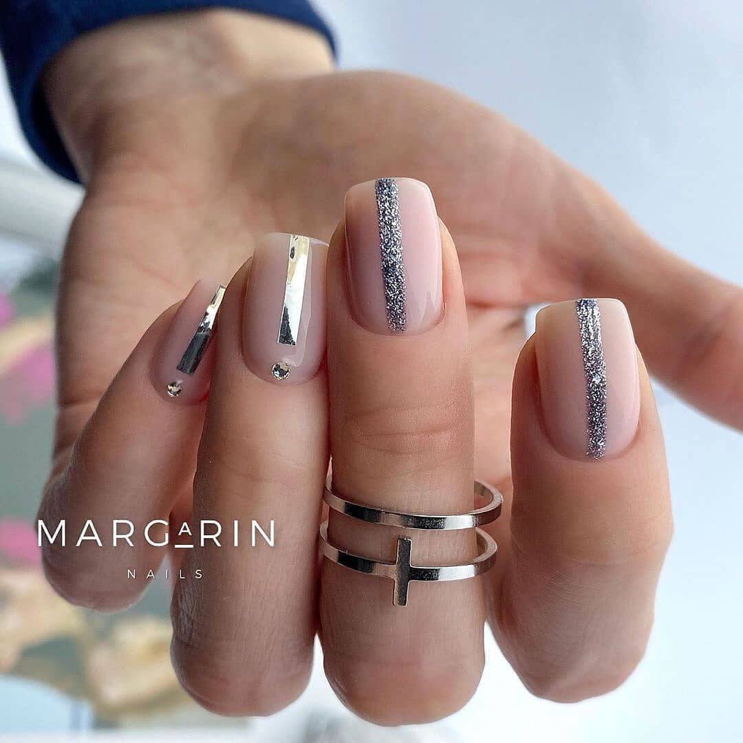 Он простой, лаконичный, но за счет блесток приковывает к себе внимание. Поэтому будьте уверены, что с этим маникюром ваш образ будет выглядеть немного более кокетливо и беззаботно