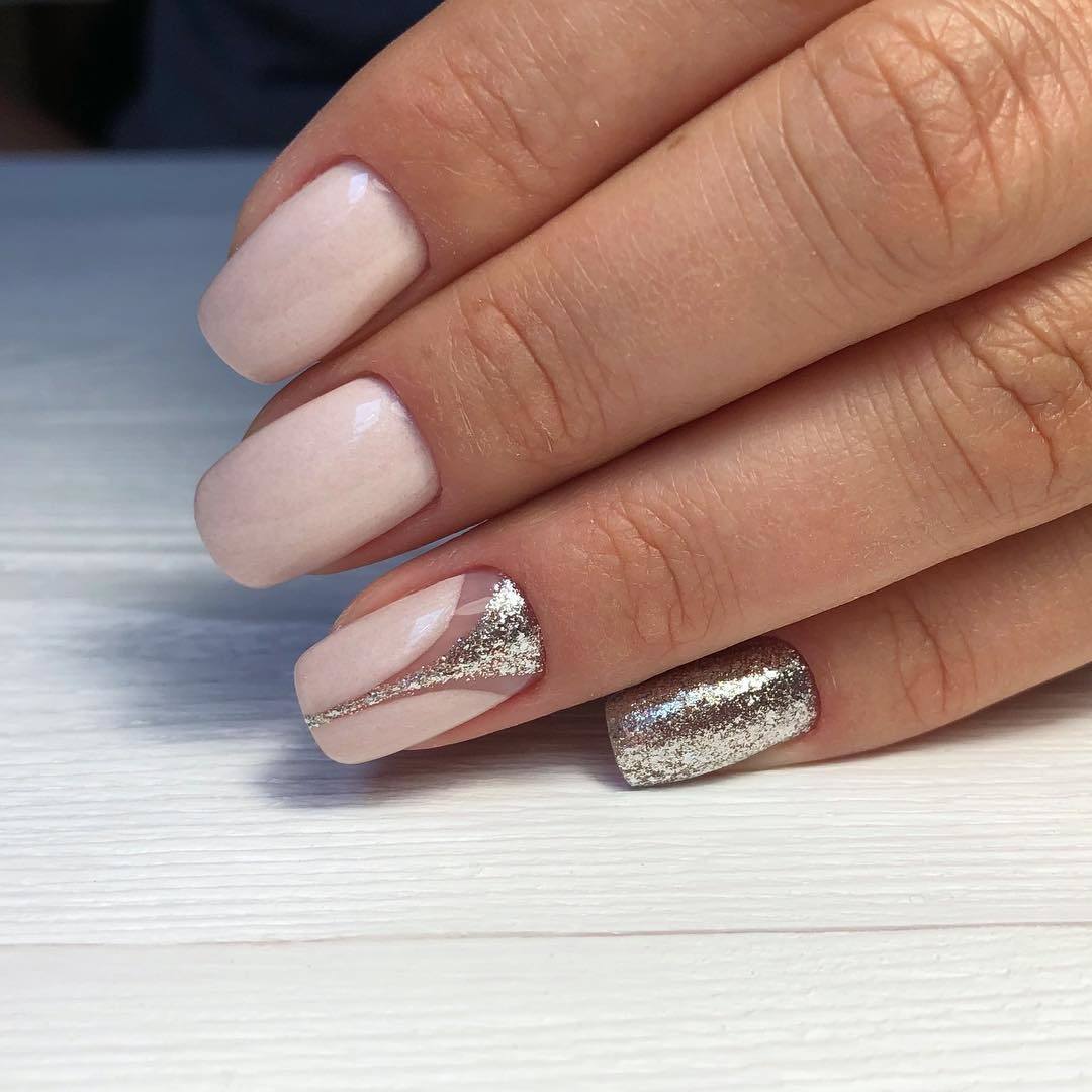 В качестве блестящего декора используйте серебряный глиттер, пайетки, втирку, сухие блестки, меланж и другой материал. Для торжественных образов воспользуйтесь золотым гель-лаком с глиттером. Под блестящий декор выделите 1-2 ноготка на руке, например, средний и безымянный, мизинец и безымянный.