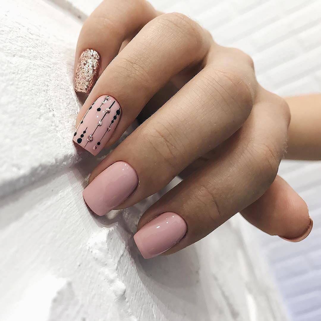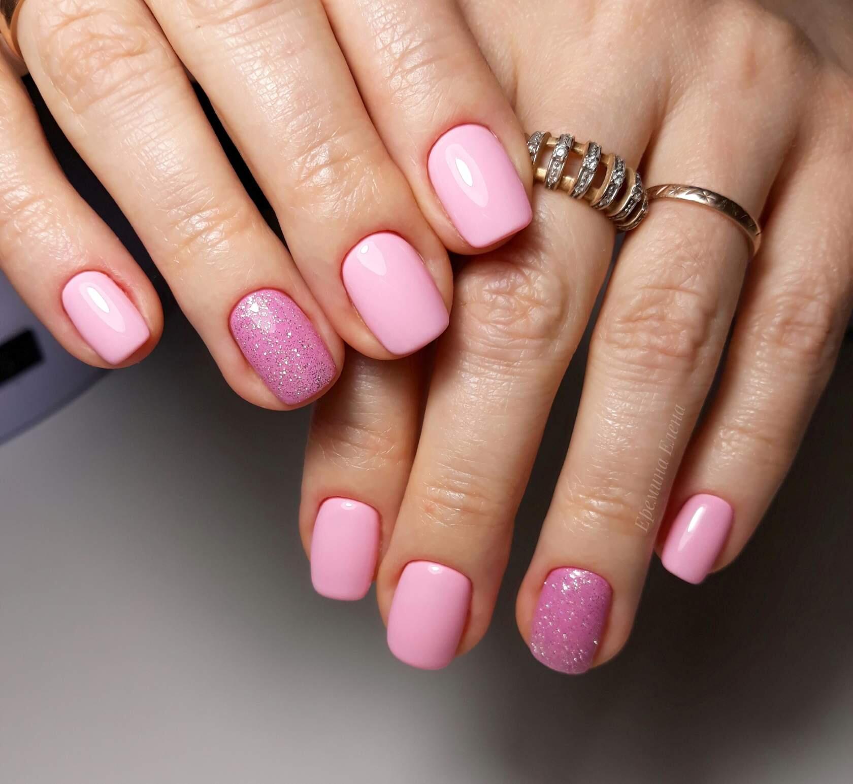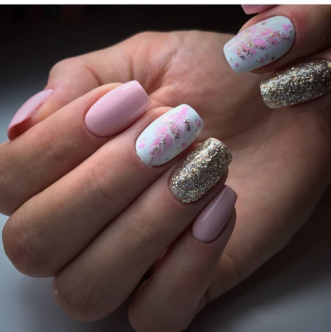 Используйте нежные розовые оттенки в сочетании с блестками, чтобы ваши ногти выглядели сладкими и очаровательными. Какой бы рисунок вы не выбрали для маникюра, его можно сделать ярче с помощью блесток: мерцающие линии, сверкающие детали…