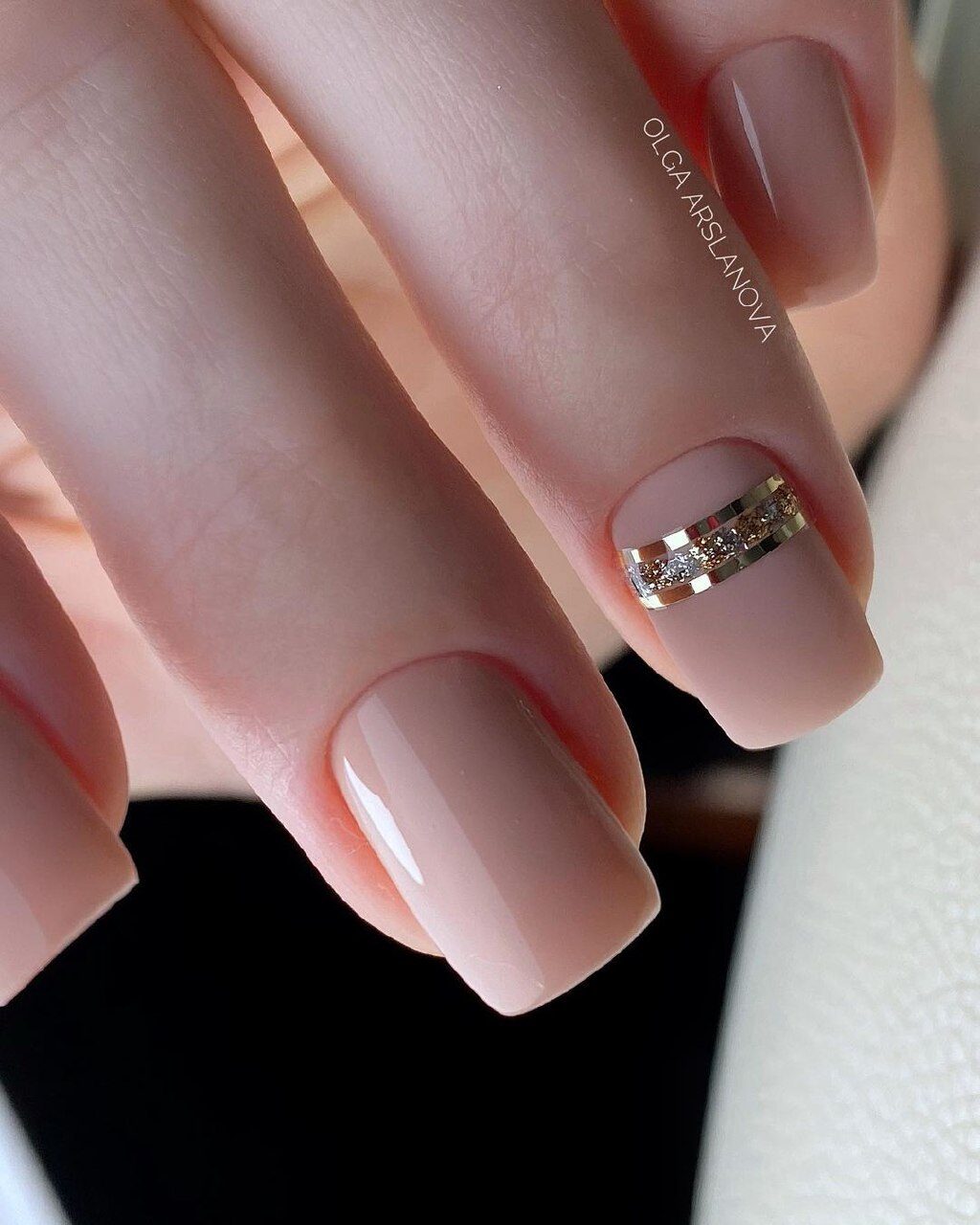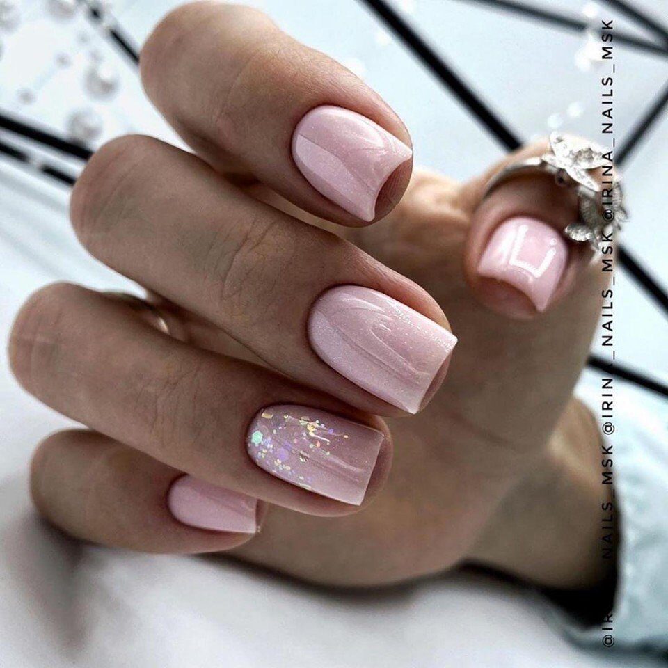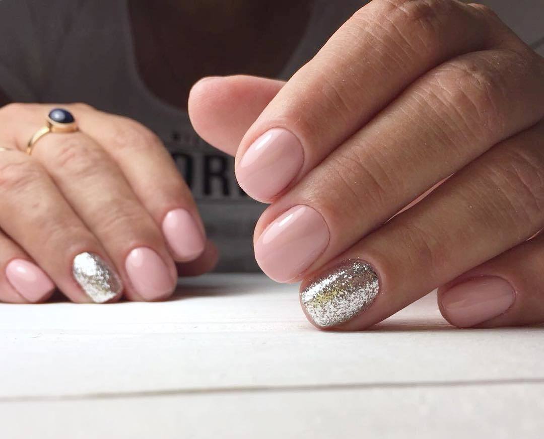 Короткие ногти, максимально нежный лак и капелька блесток у основания ноготка, на безымянном пальце — все что нужно для повседневного маникюра.