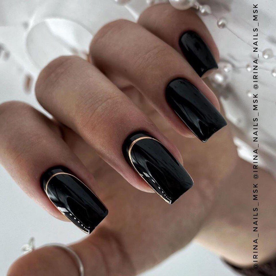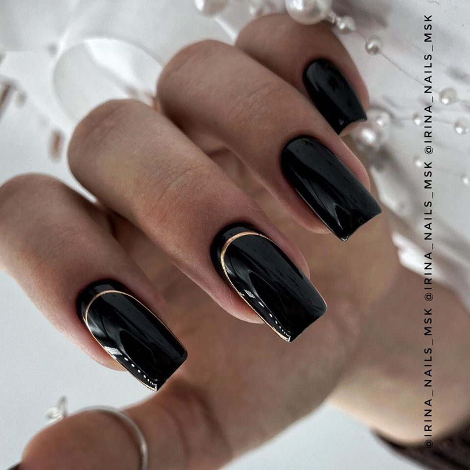 Как вы понимаете, для столь оригинального оттенка блёсток следует подобрать достойное основание, и в этом примере, нейл-дизайнеры предлагают отдать предпочтение не только контрастным светлым тонам. Тёмный маникюр с блестящими угольно-чёрными деталями смотрится весьма интересно, необычно и привлекательно. Это может быть растяжка сверкающих фрагментов, чёткая прорисовка свободного края ногтевой пластины и многие другие идеи.