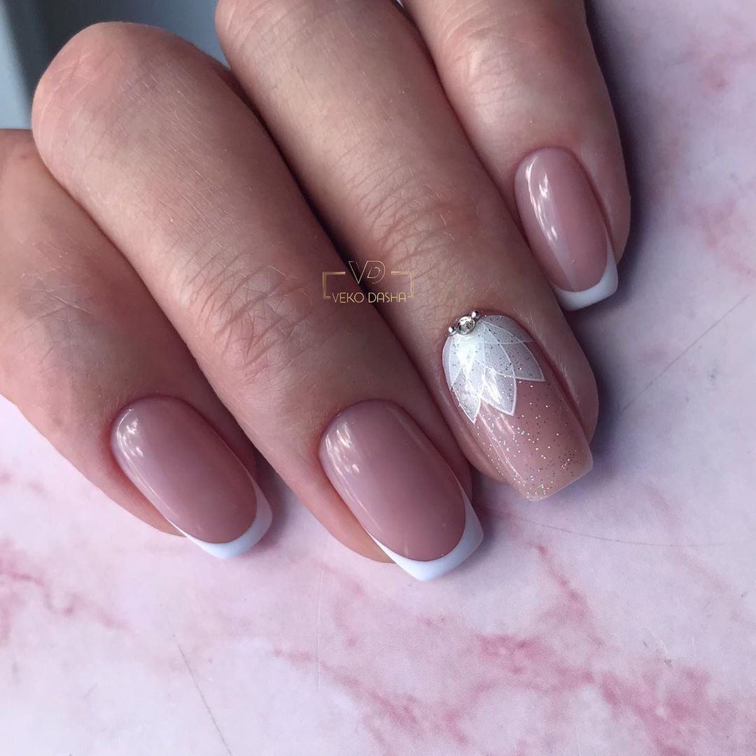Этот дизайн отличается малым количеством блёсток. Для начала необходимо сделать лунный маникюр или френч. Далее в зависимости от выбора невесты ноготь покрывают блёстками. Длина ногтя в свадебном маникюре не имеет значения.