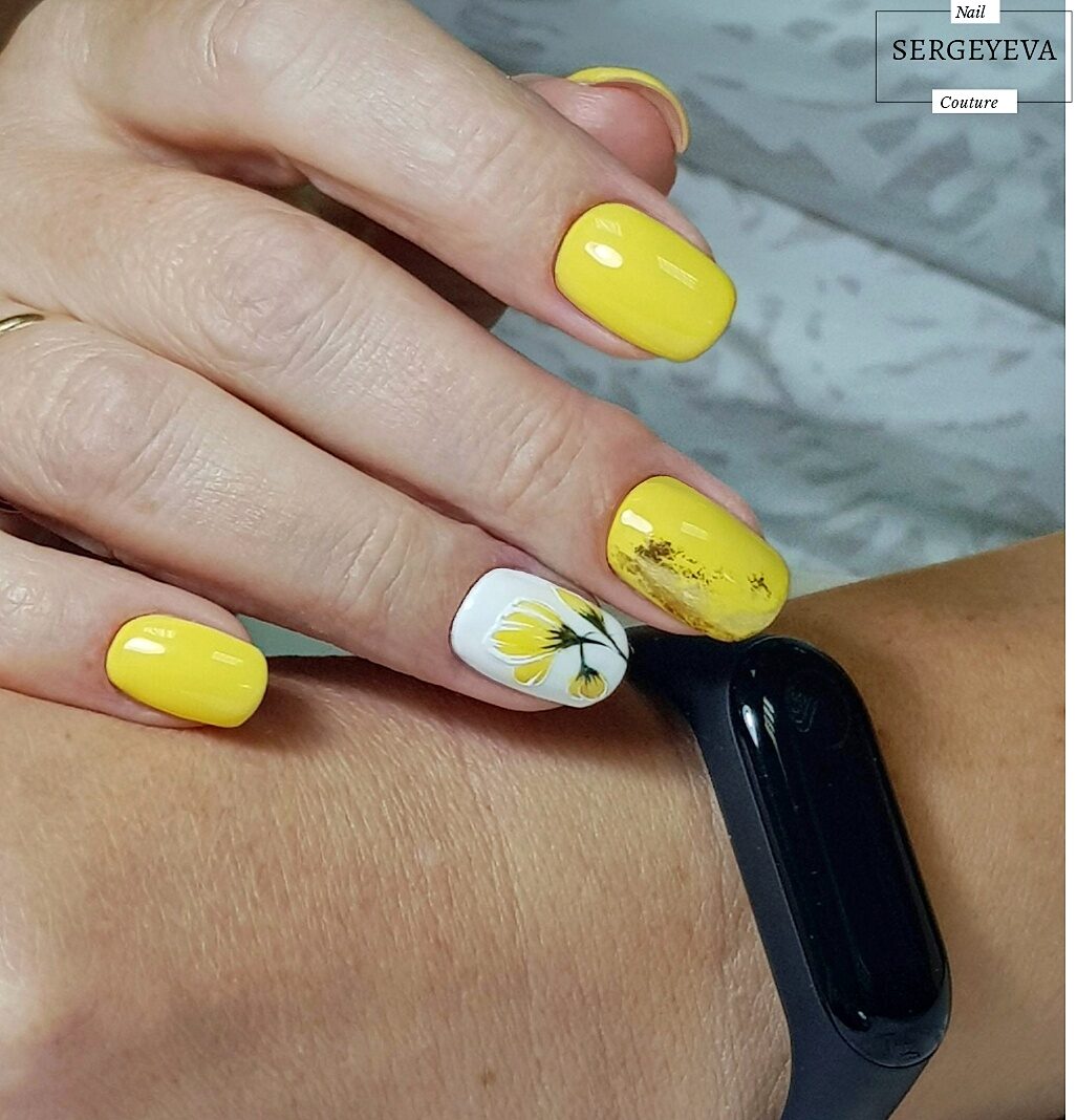 Необязательным условием является желтый цвет как основа маникюра. Очень красиво, привлекательно, свежо смотрится желтый дизайн или его элементы в маникюре других цветов. Самые распространенные сочетания в маникюре и дизайне: желтый и черный, желтый и белый, весенне-летние оттенки желтого и разные оттенки зеленого, осенний песочный и глубокий бордо, желтые смайлики на любом фоне в любое время года!