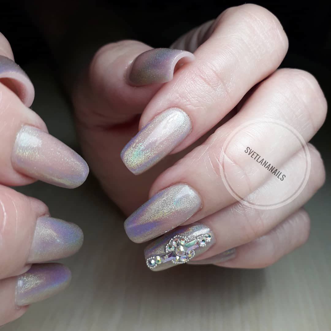 Шиммер — представляет собой очень мелкие частицы сияющей пудры. Шиммер очень красиво переливается на ногтях, создавая радужные переливы.