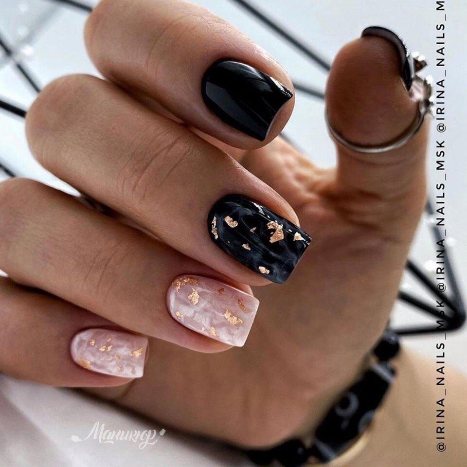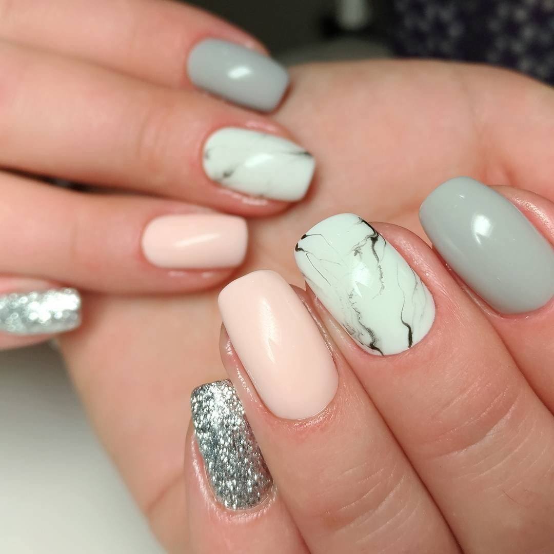 В 2020 году в моде лаконичный мраморный дизайн. Тонкие линии имитируют естественную фактуру натурального камня. Благодаря чему маникюр получается очень красивым и идеально подходит даже на каждый день. Интересно, что выполнить его можно даже в домашних условиях. Для этого понадобится набор кистей разного размера и формы, а также несколько оттенков лака. Альтернативным решением может быть слайдер-дизайн, который значительно ускоряет процесс оформления. Что касается блесток, то в данном случае их используют минимально. В основном их можно увидеть на рисунке.
