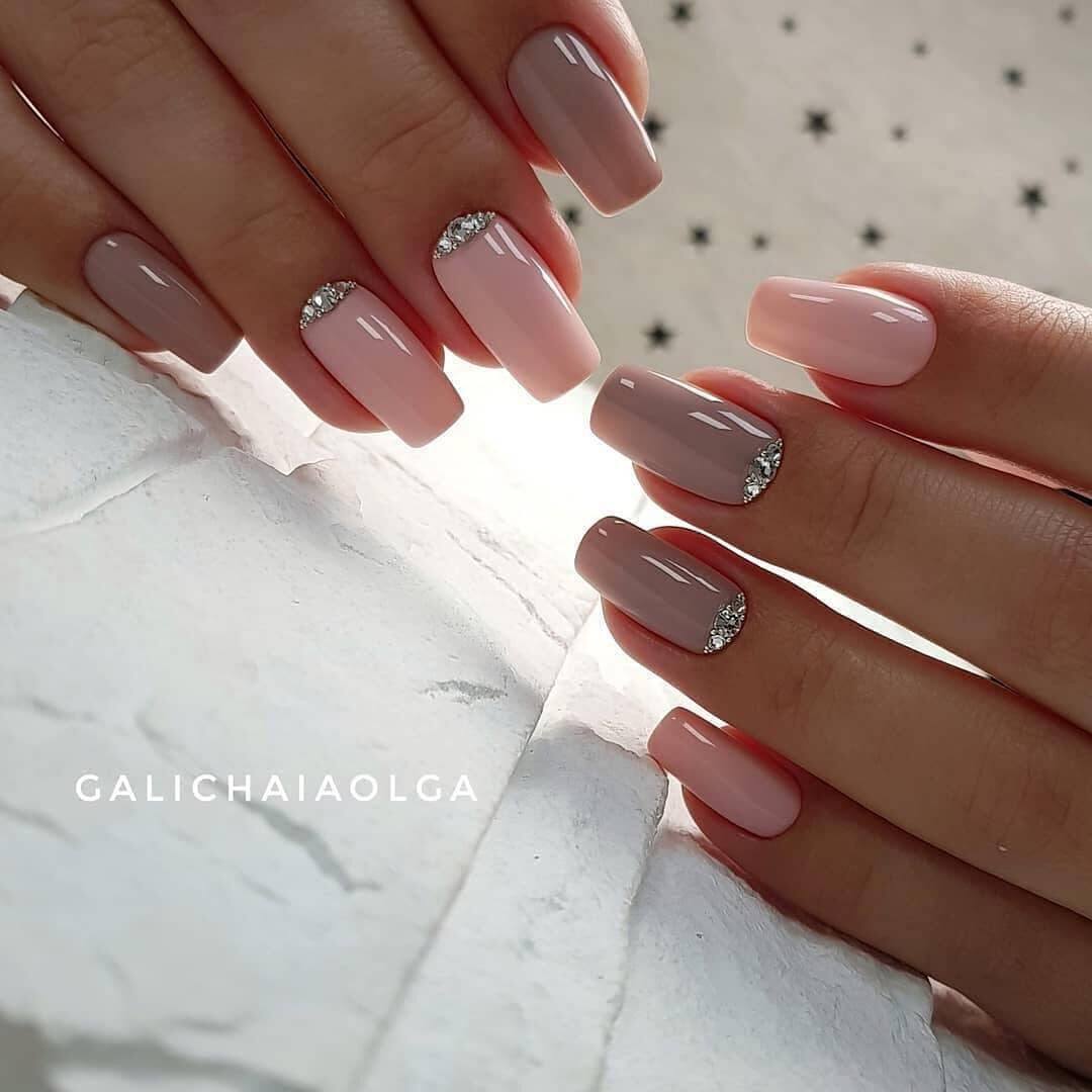 Шикарный нюдовый оттенок с розовым подтоном взято за базу и яркое украшение из разноцветных камушек. Очень нравится, что украшение камушками на большом и безымянном пальчике, просто отличный вариант для маникюра в любое время года.