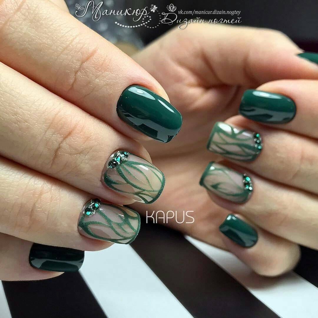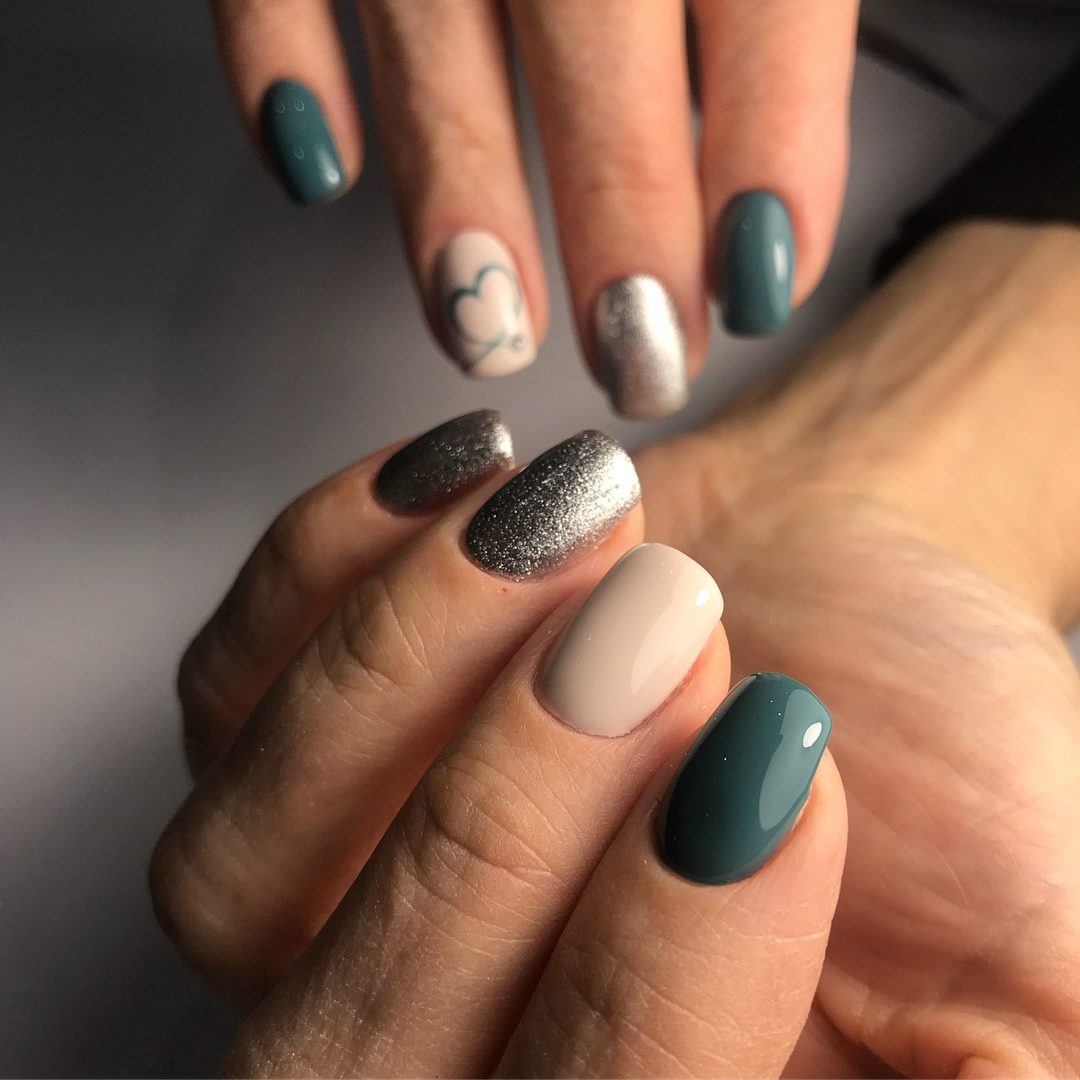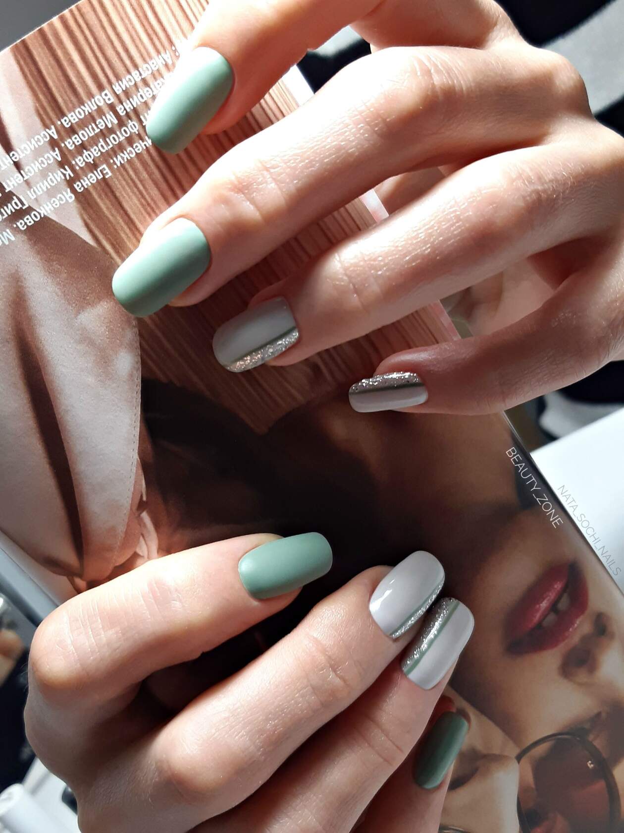 В этом маникюре безупречно все: форма и длина ногтей, переход от темного зеленого к более светлому и даже к белому, и естественно безупречные серебристые блестки.