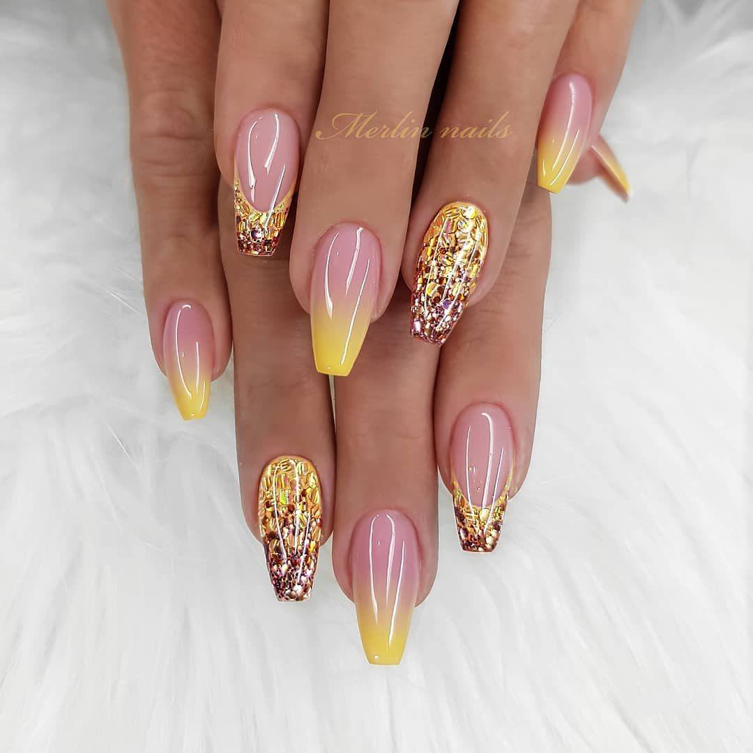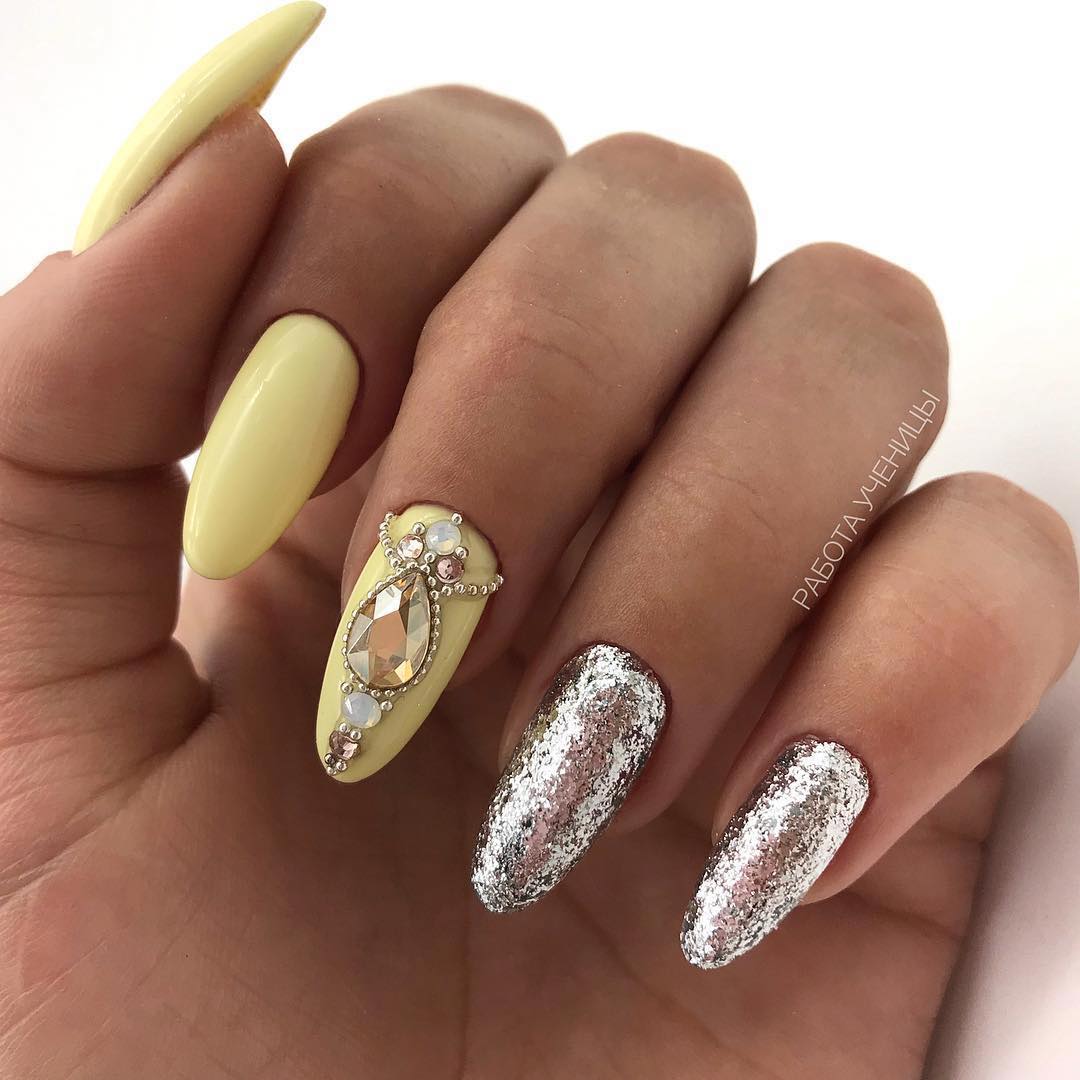 Популярным остается и «кошачий глаз», в том числе и разных оттенков желтого и желто-золотистого цветов. Относительно новый вид желтого маникюра с блестками – 3D маникюр — глубокий, насыщенный, блестящий и эффектный.