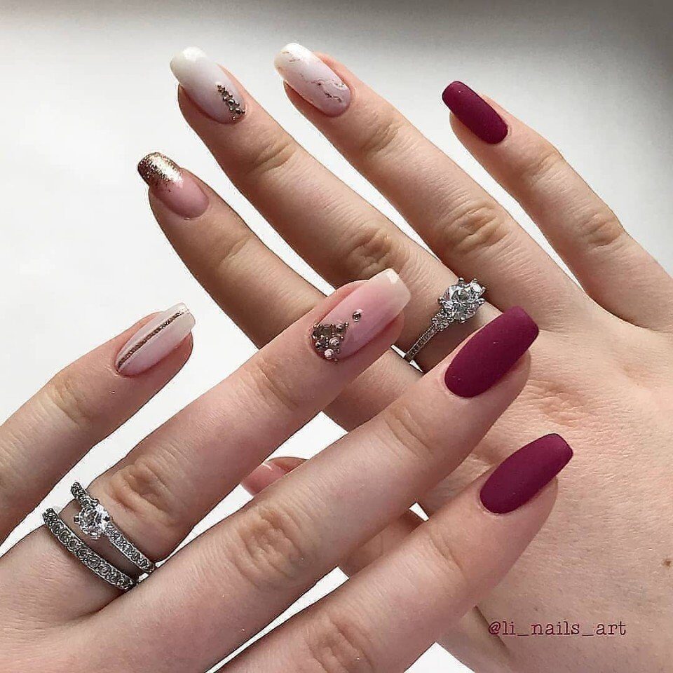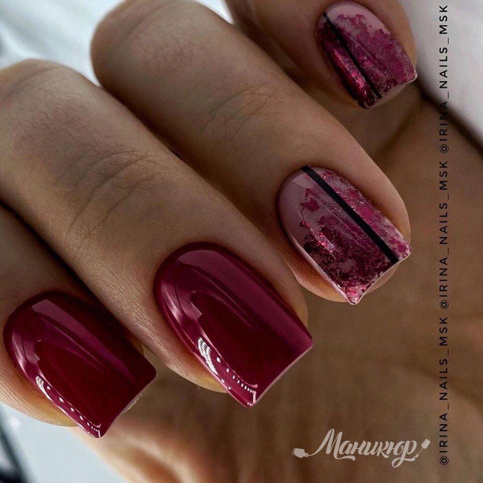 Прекрасный марсаловый маникюр, к которому добавлено несколько камушек на акцентные пальцы.